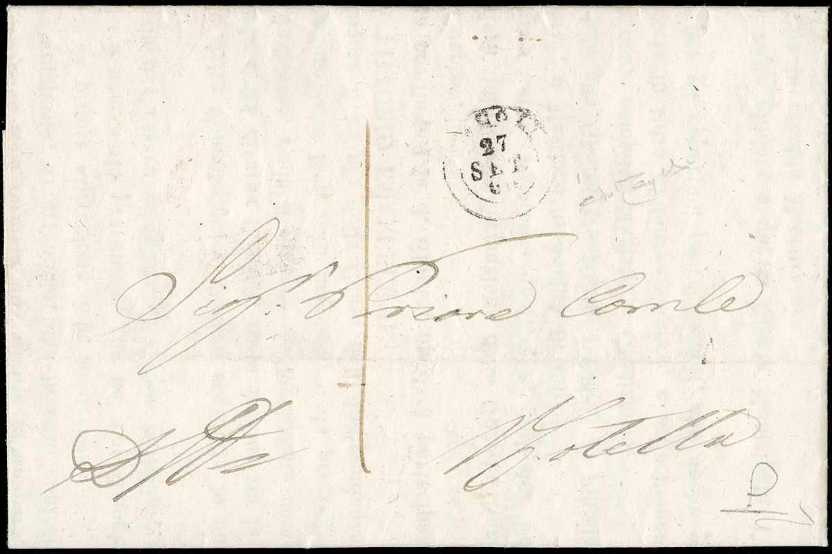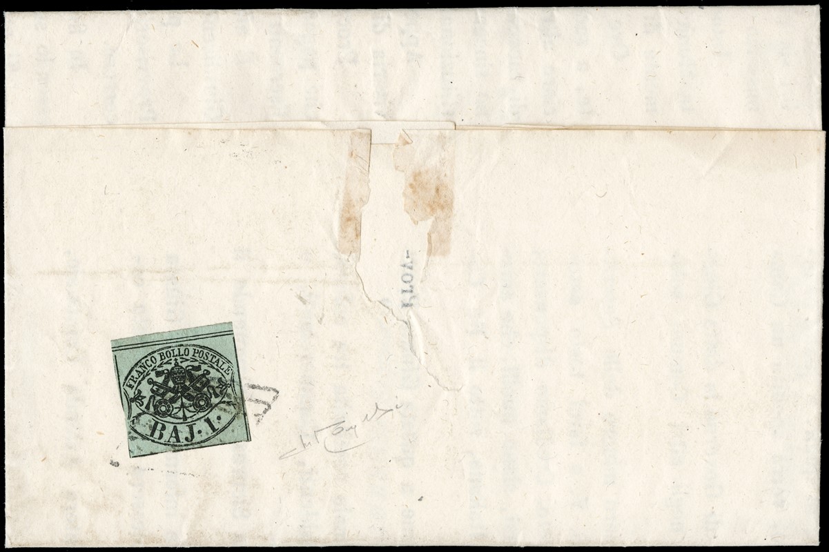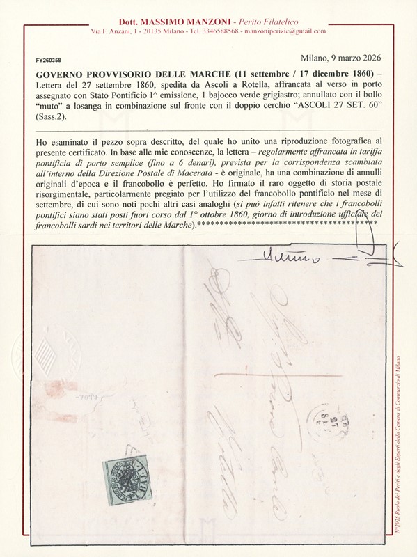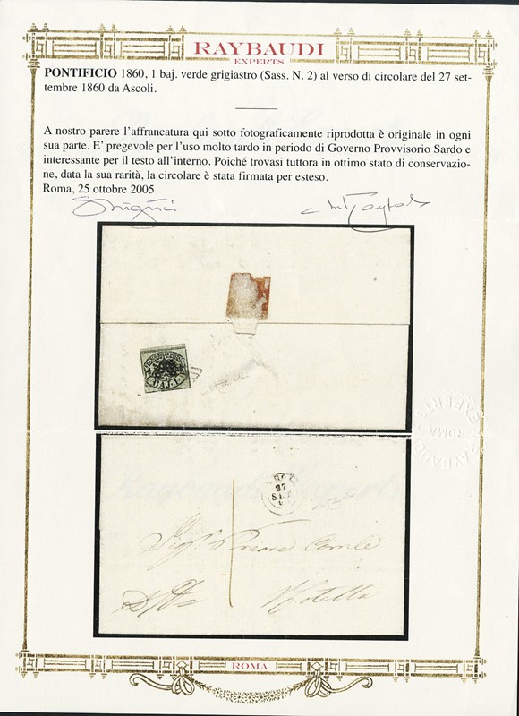 1860 - 1b verde grigiastro al verso di lettera in porto assegnato da 'ASCOLI 27 SET 70' per Rotella. Si tratta di una delle ultime lettere note affrancate con francobolli dello Stato Pontificio e non tassate, in periodo di Governo Provvisorio delle Marche. Rarissimo oggetto di storia postale risorgimentale, CF Manzoni e Raybaudi (Sassone 2 - Euro - )