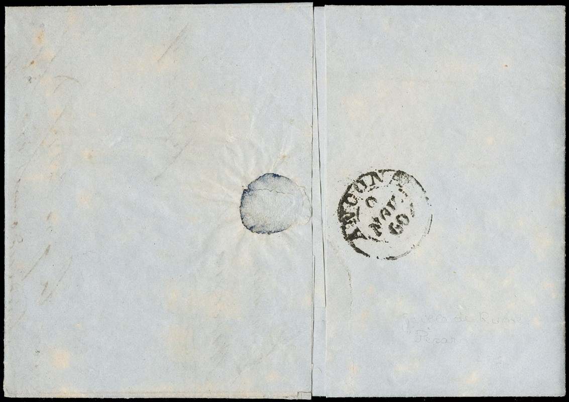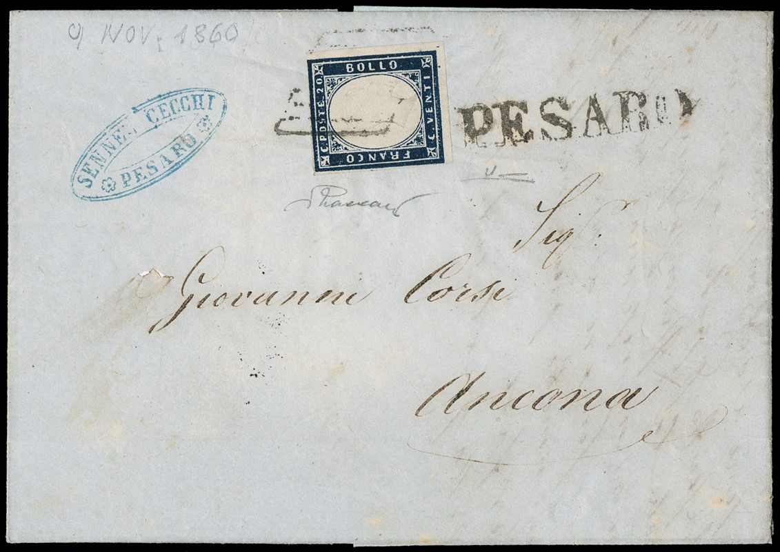 1860 - Sardegna IV em. 20c azzurro scurissimo, I tav tir.'60, da 'PESARO' (SD) per Ancona il 9 novembre 1860. Rara lettera in periodo commissariale delle Marche. Firma Vaccari, CF Manzoni (Sassone 15C - Euro - )