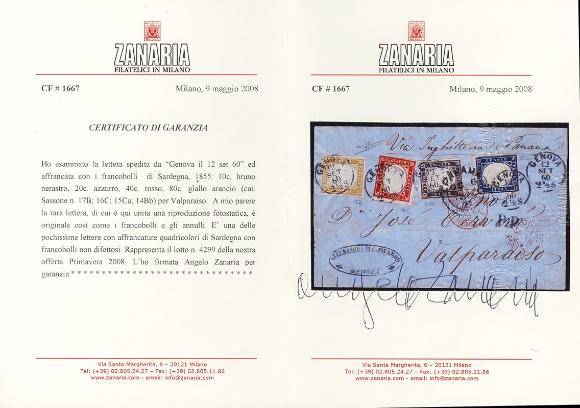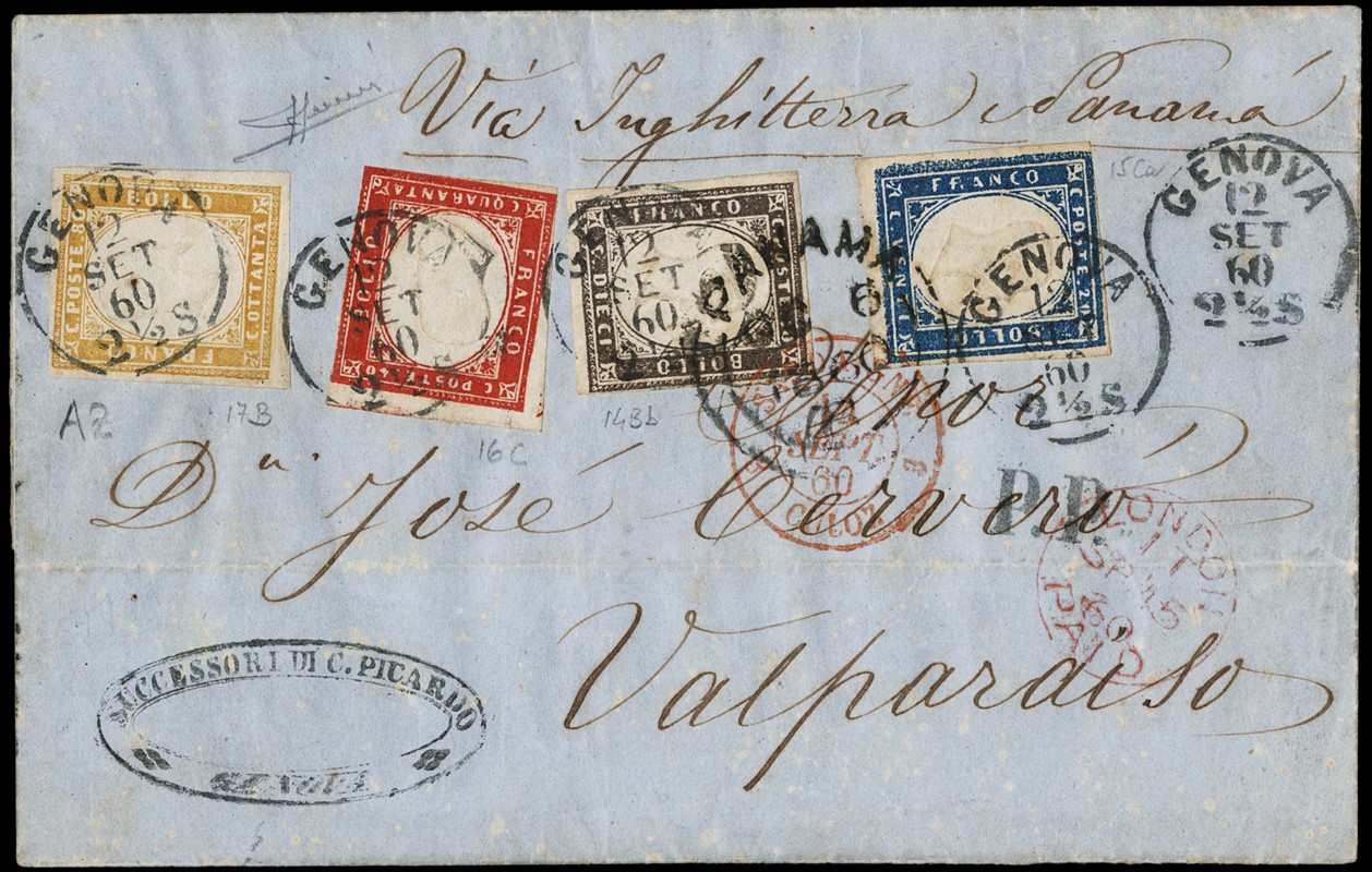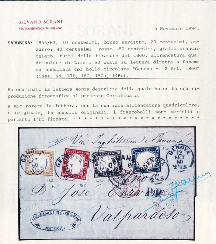 1860 - Sardegna, IV emissione, 10c bruno nerastro, I tav., 20c azzurro, I tav., 40c rosso e 80c giallo arancio, tutti tir.'60, da 'GENOVA 12 SET 60' a Valparaiso (Cile). Rara affrancatura quadricolore con tutti i francobolli perfetti. CF Sorani e Zanaria (Sassone 14Bb+15Ca+16C+17B - Euro 12.860+)