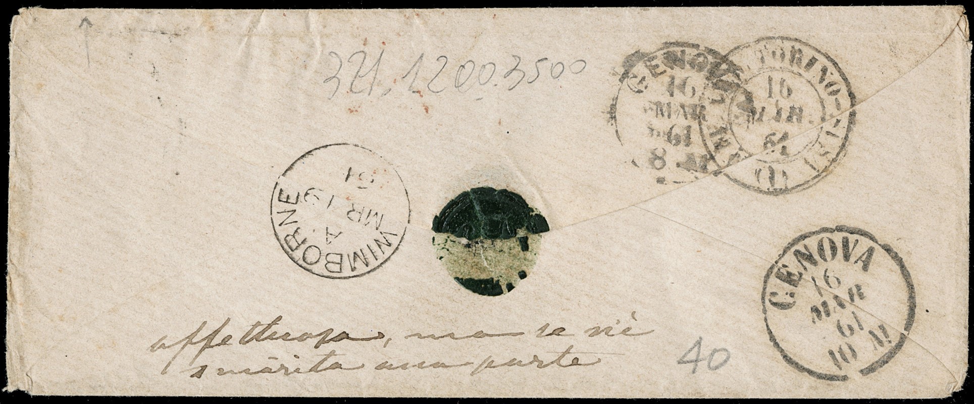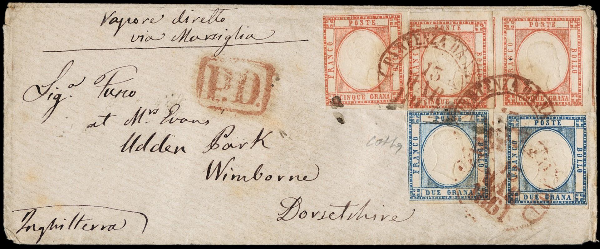 1861 - Province Napoletane, 2gr azzurro chiaro, due esemplari, e 5 grana rosso carminio, tre esemplari, da 'PARTENZA DA NAPOLI 13 MAR. 1861' per Wimborne (Inghilterra), franca a destino. Francobolli con qualche margine corto, affrancatura comunque molto pregiata. Sigla Colla (Sassone 20+21 - Euro 2.625+)