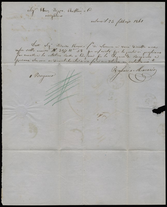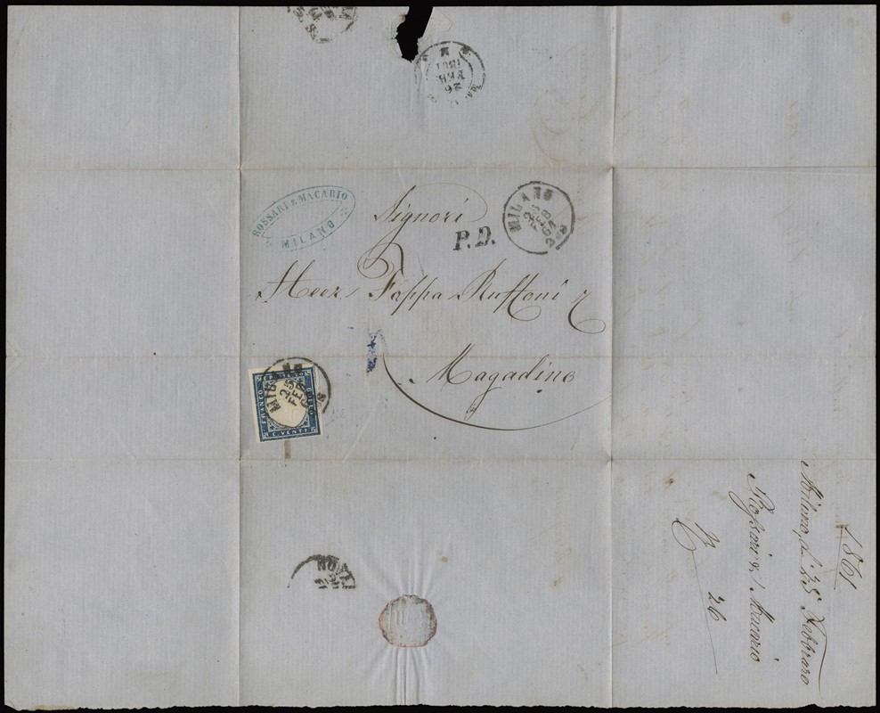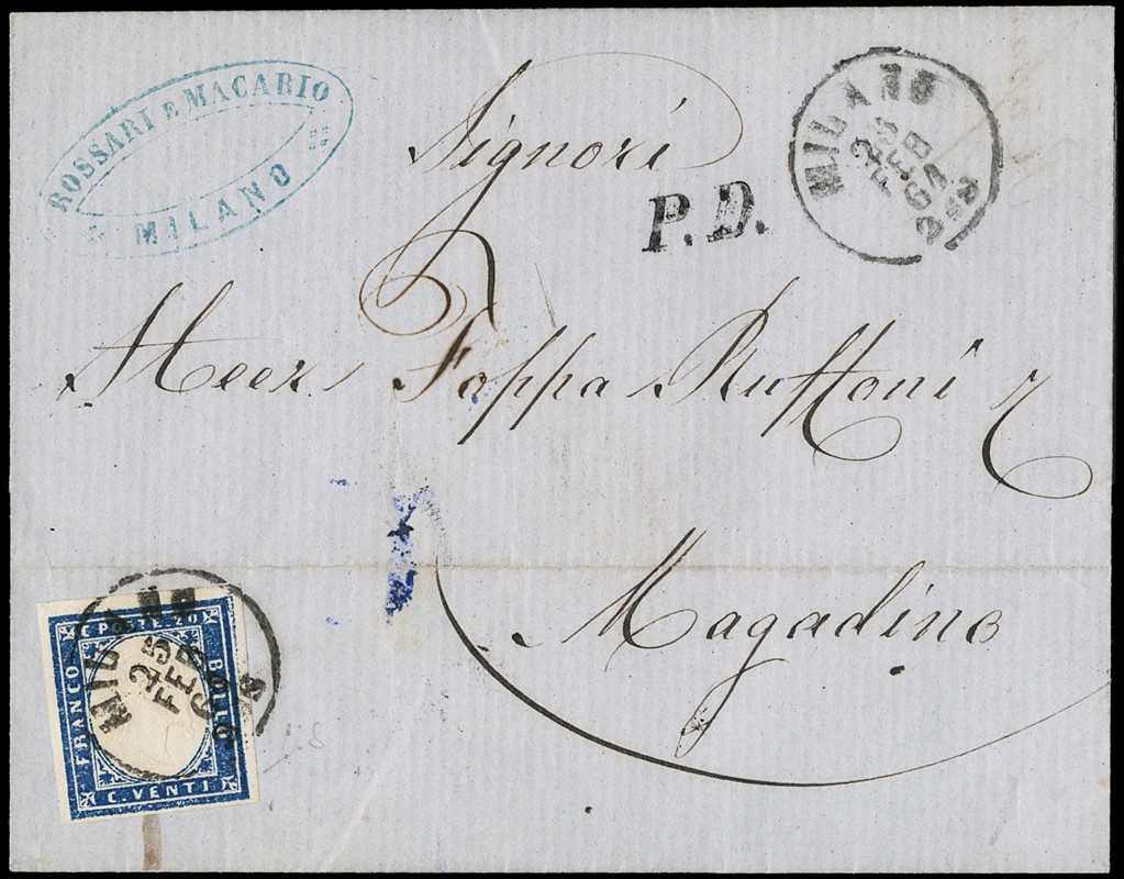 1861 - Sardegna, IV emissione, 20c azzurro fresco e ben marginato, da 'MILANO 25 FEB 61' a Magadino, in tariffa limitrofa per la Svizzera. Sigla Fiecchi (Sassone 15Ca)
