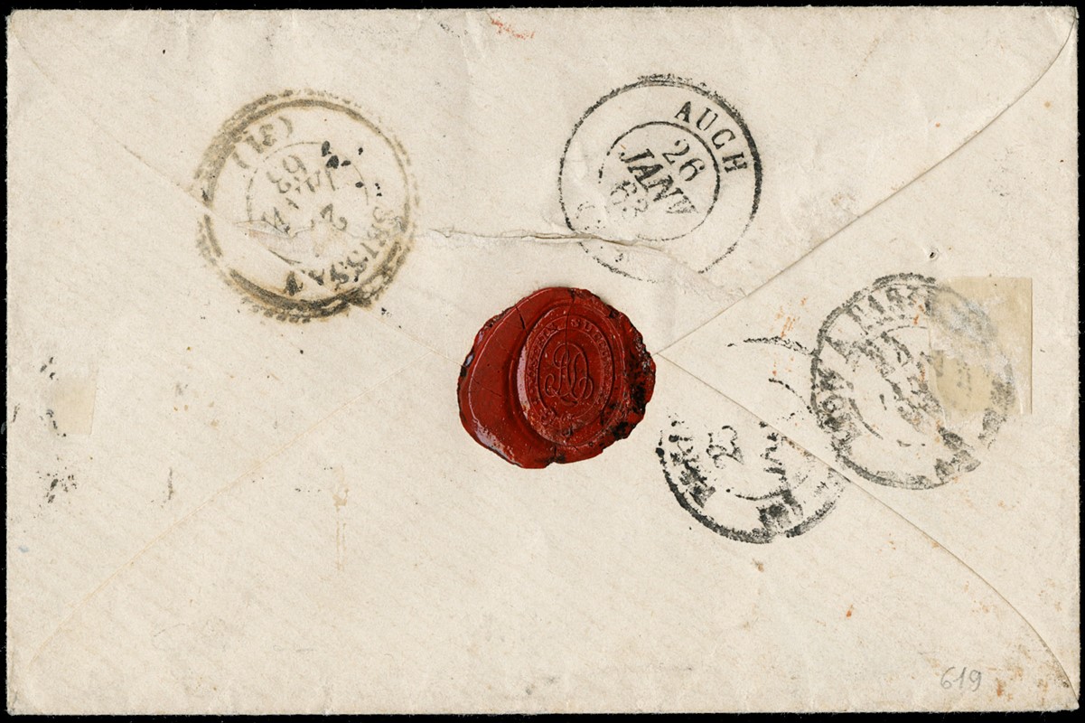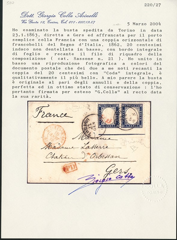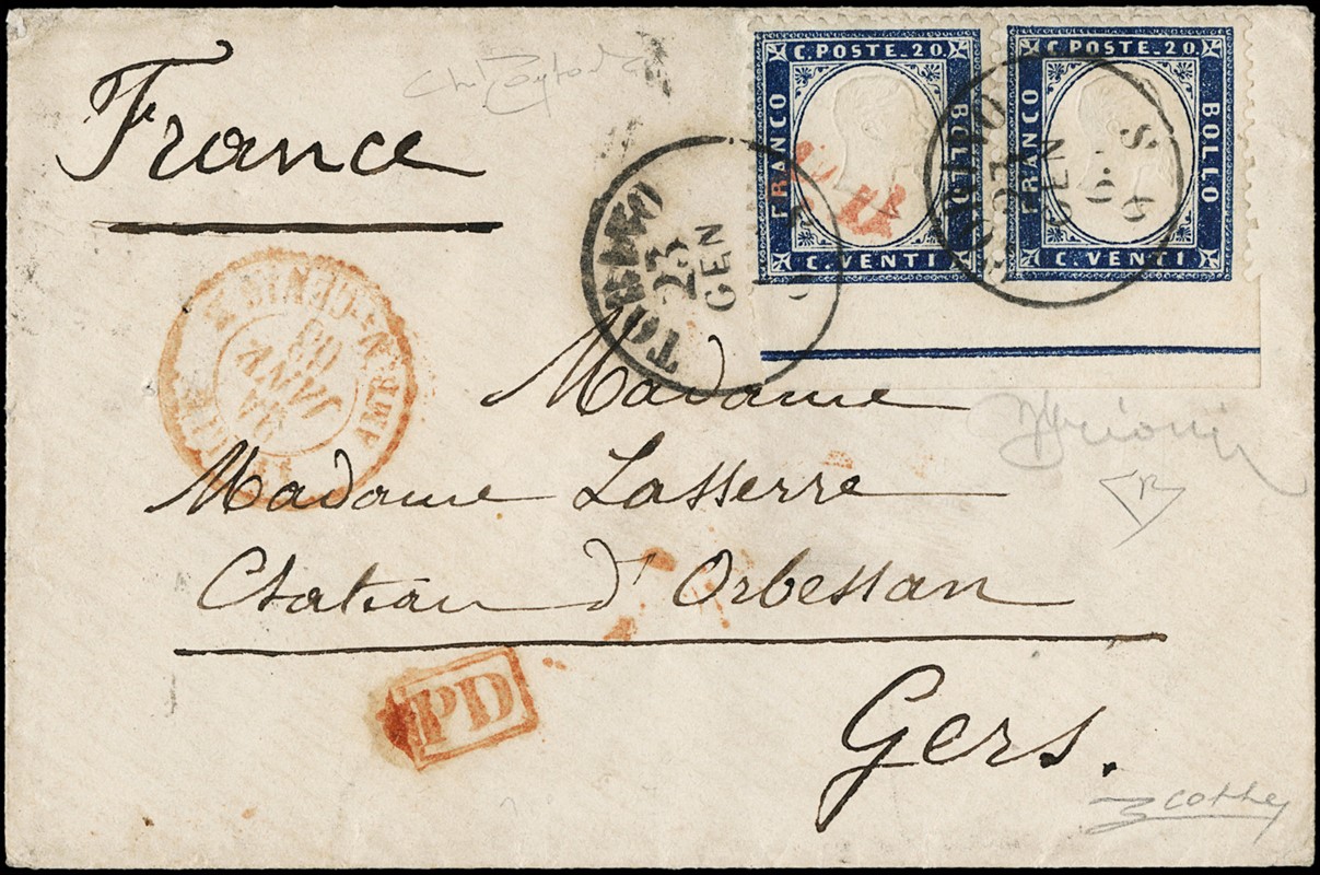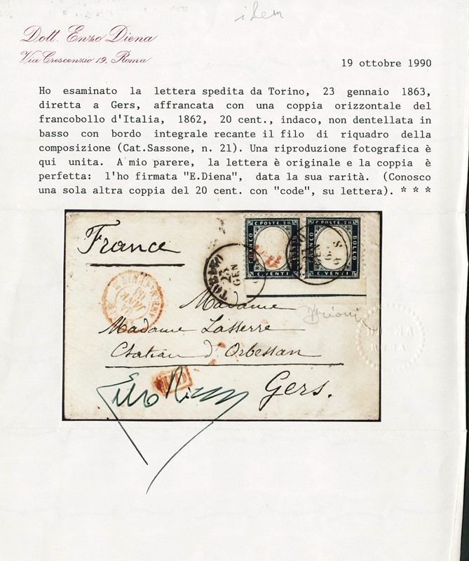 1862 - 20c indaco, coppia BdF non dentellata in basso con bordo integrale e linea di riquadro nel margine inferiore, da 'TORINO 23 GEN 63' a Gers. Rarissimo. Firma Grioni, CF E.Diena: 'conosco una sola altra coppia del 20c con 'Code' su lettera' e Colla '...dei due a me noti...e' qualitativamente il piu' bello' (Sassone 2l - Euro - )