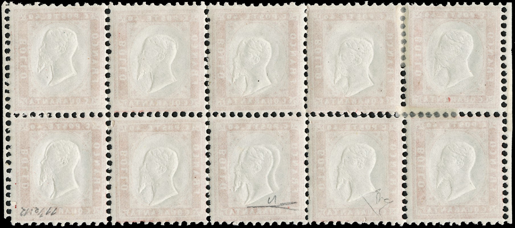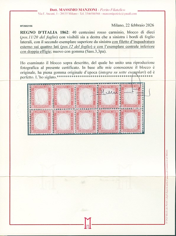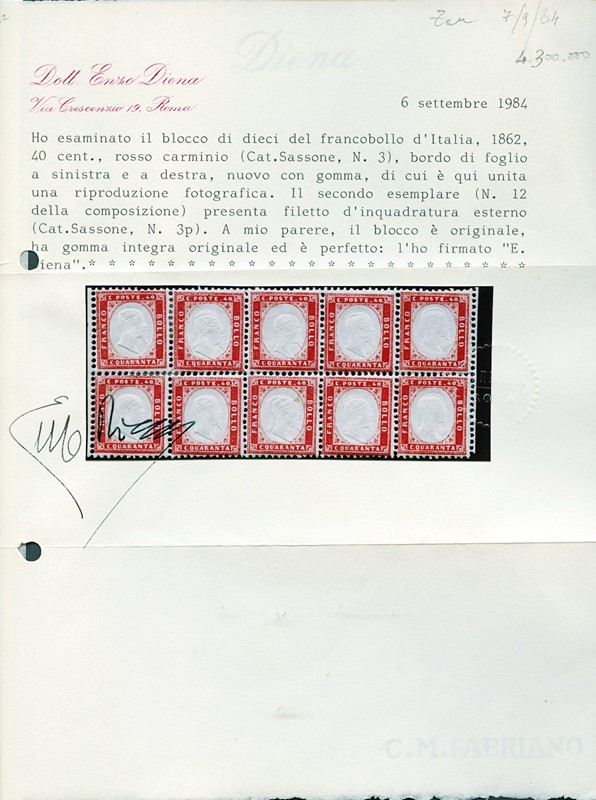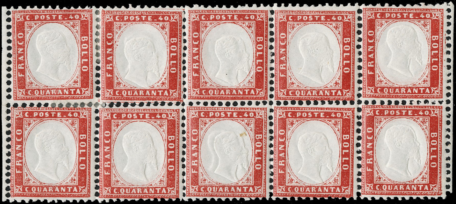 1862 - 40 c rosso carminio BL10 (sette SL) con visibili bordi di foglio laterali. Il secondo esemplare superiore da sinistra con filetto d'inquadratura esterno completo (pos.12 della composizione); l'esemplare inferiore centrale con doppia testa. CF E.Diena e Manzoni (Sassone 3/3p - Euro 13.200)