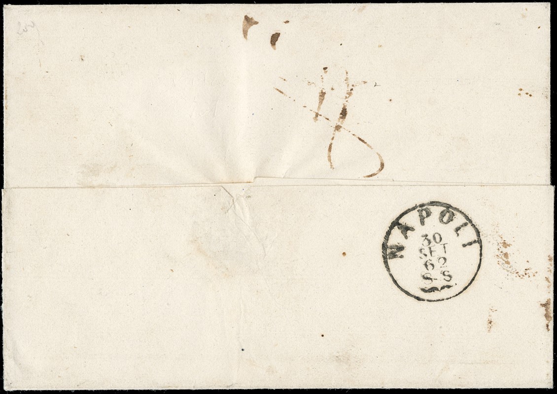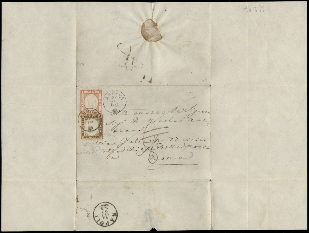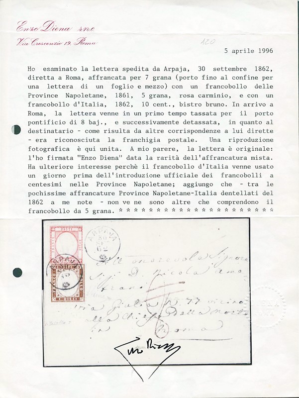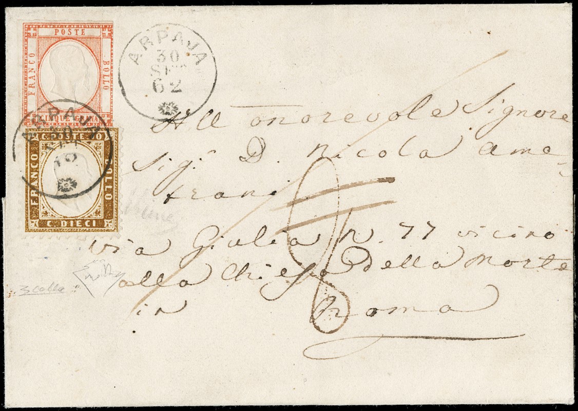 1862 - 5 grana rosso carminio (leggermente corto a destra) in affrancatura mista con Regno d'Italia, Matraire dentellati 10c bistro oliva (al cambio 2 grana) da 'ARPAJA 30 SET 62' a Roma. Affrancatura da 7 grana valida fino al confine italiano, tassata a penna in arrivo '8' (bajocchi) per le competenze interne pontificie, poi detassata in quanto il destinatario godeva di franchigia. Unica affrancatura mista nota cosė composta, impreziosita dal fatto che il francobollo italiano fu utilizzato il giorno antecedente la sua introduzione nel napoletano. Firme Em.Diena e Colla, CF E.Diena (Sassone Regno 1 + Prov Nap 21)