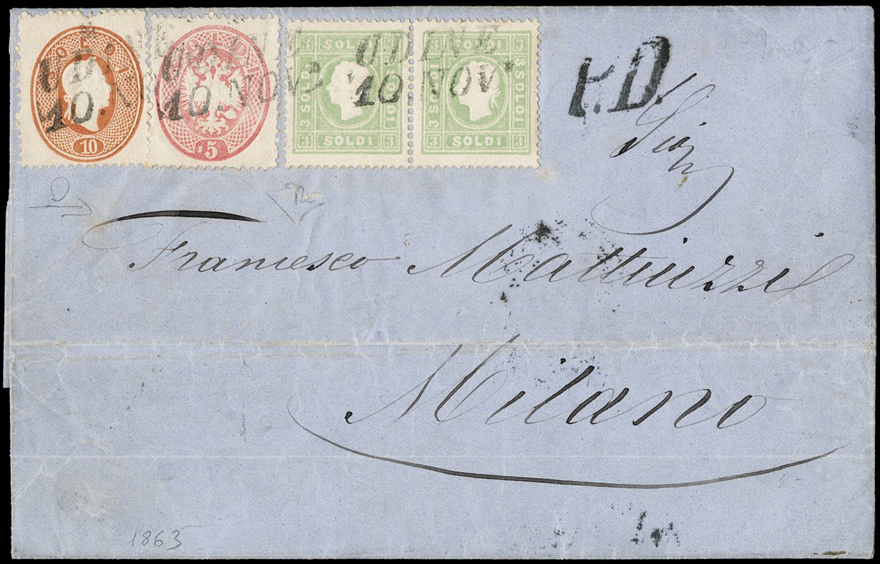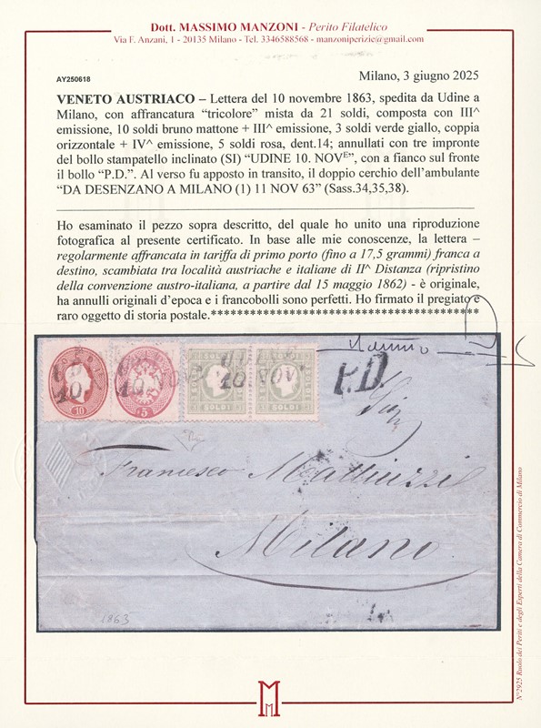 1862 - III emissione 10s bruno marrone, 3s verde giallo, coppia, e IV emissione 5s rosa da 'UDINE 10 NOV' 1865 a Milano. Splendida tricolore di tre diverse emissioni. Firma E.Diena e CF Manzoni (Sassone 34+35+38 - Euro 32.500)