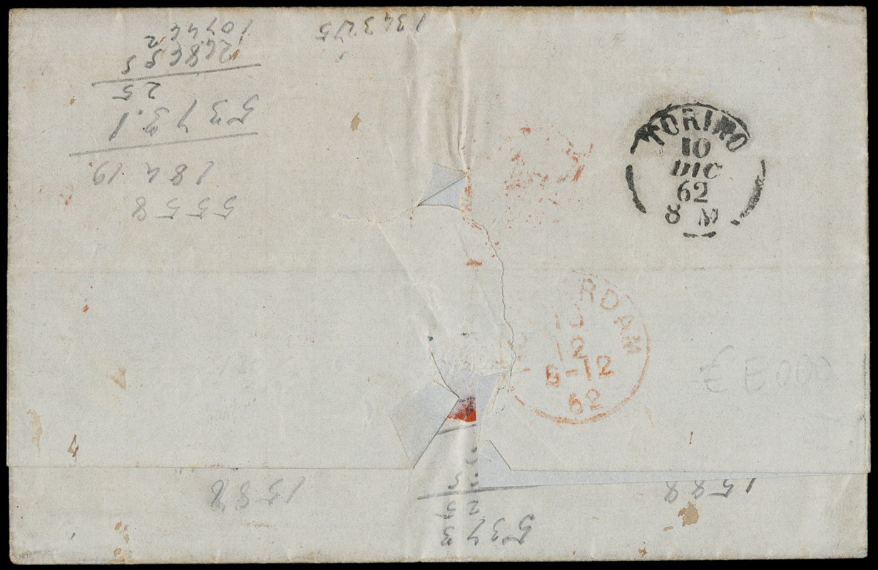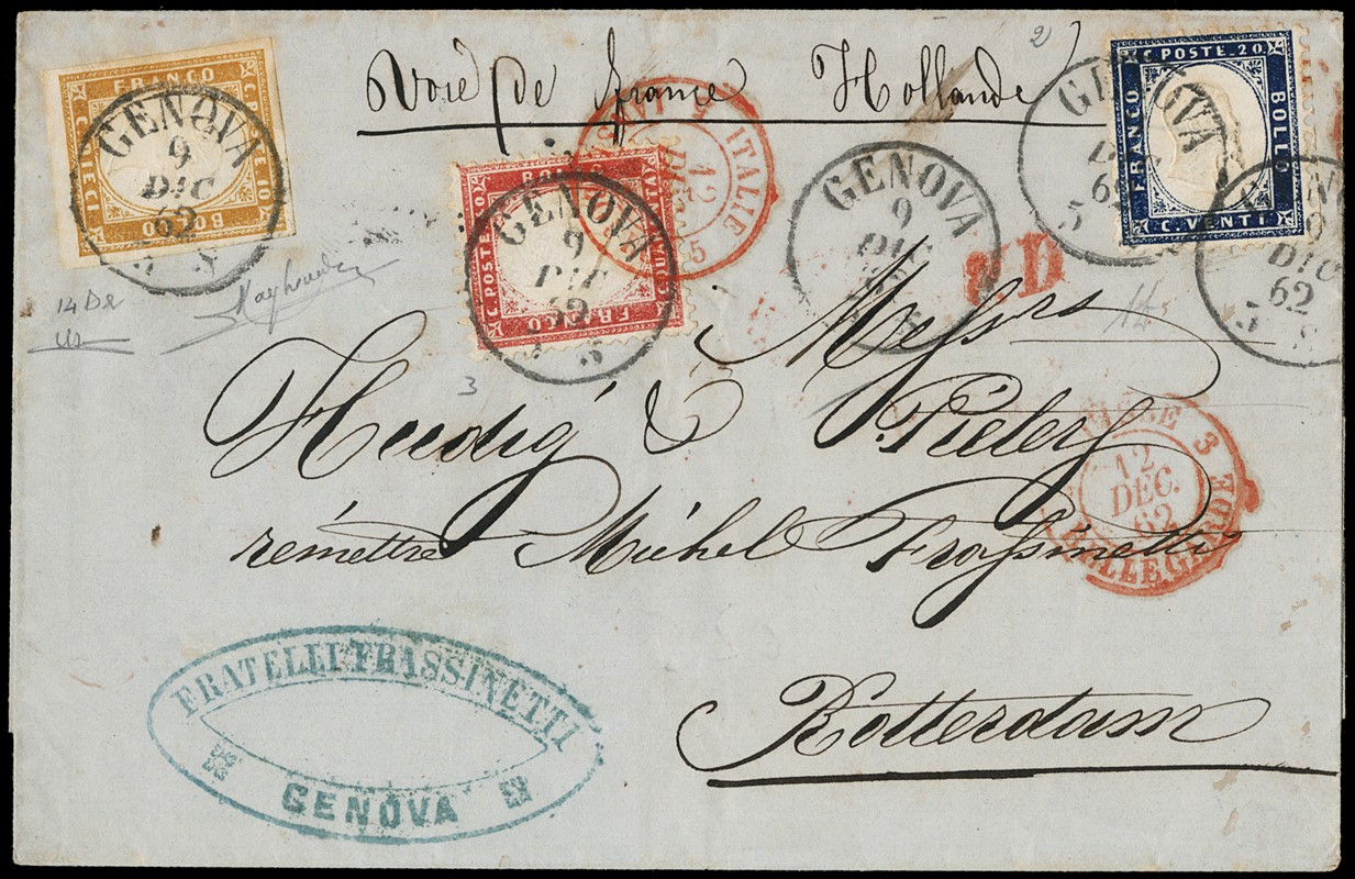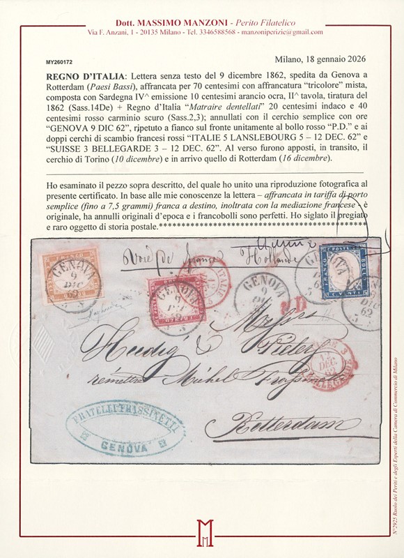 1862 - Matraire 20c indaco e 40c rosso carminio, in affrancatura mista con Sardegna IV emissione 10c arancio ocra, da 'GENOVA 9 DICEMBRE 1862' a Rotterdam. Rara affrancatura tricolore mista. Firma A.Diena e Raybaudi, CF Manzoni (Sassone 2+3+Sard 14De - Zanaria-Serra Euro 7.000+)