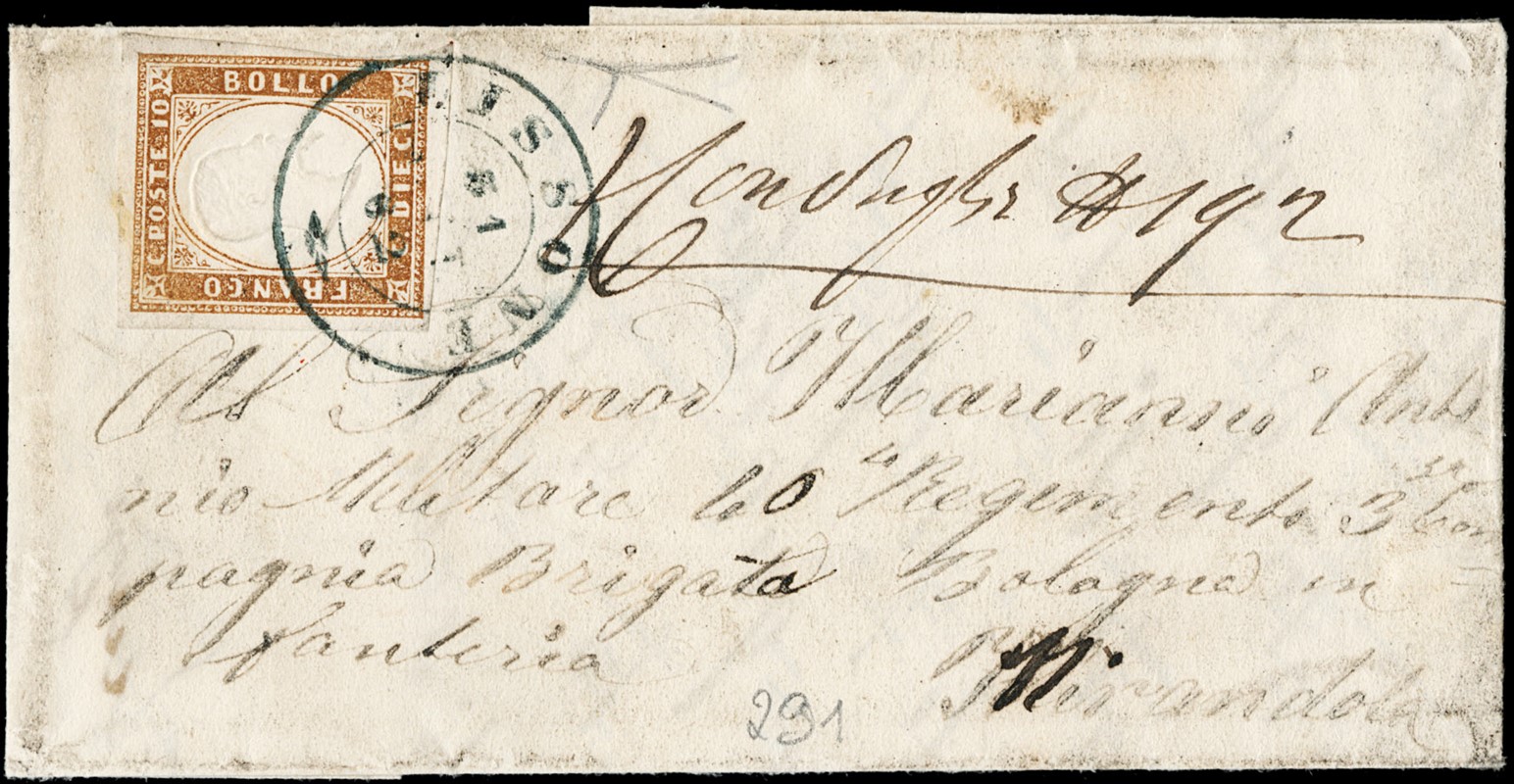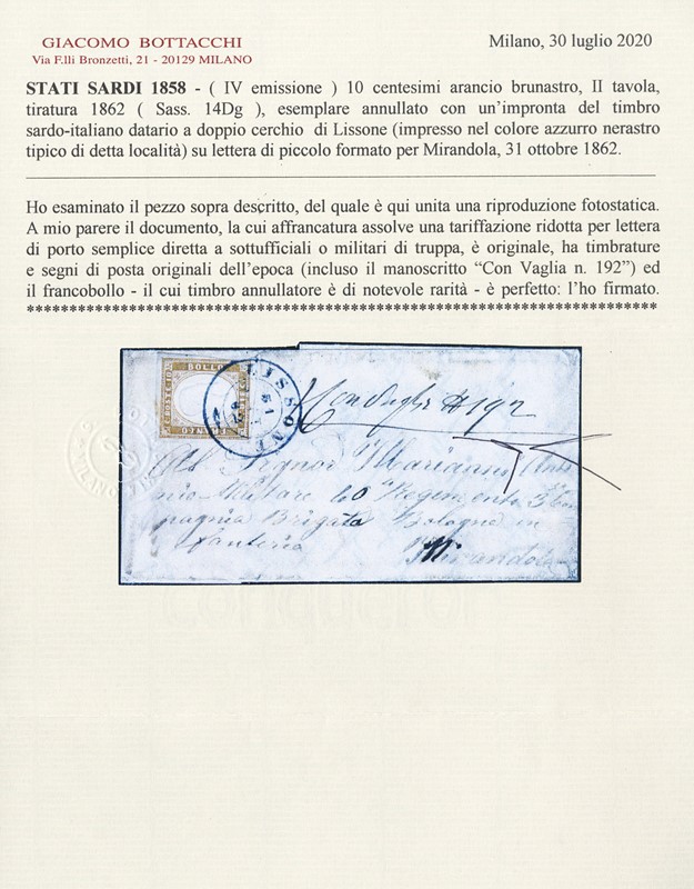 1862 - Sardegna 10c arancio brunastro, uso isolato in tariffa ridotta per militari su lettera di piccolo formato da 'LISSONE 31 OTT. 62' (datario a doppio cerchio azzurro nerastro sardo-italiano) per Mirandola. CF Bottacchi (Sassone 14Dg+pt.13 - Euro 13.000++)