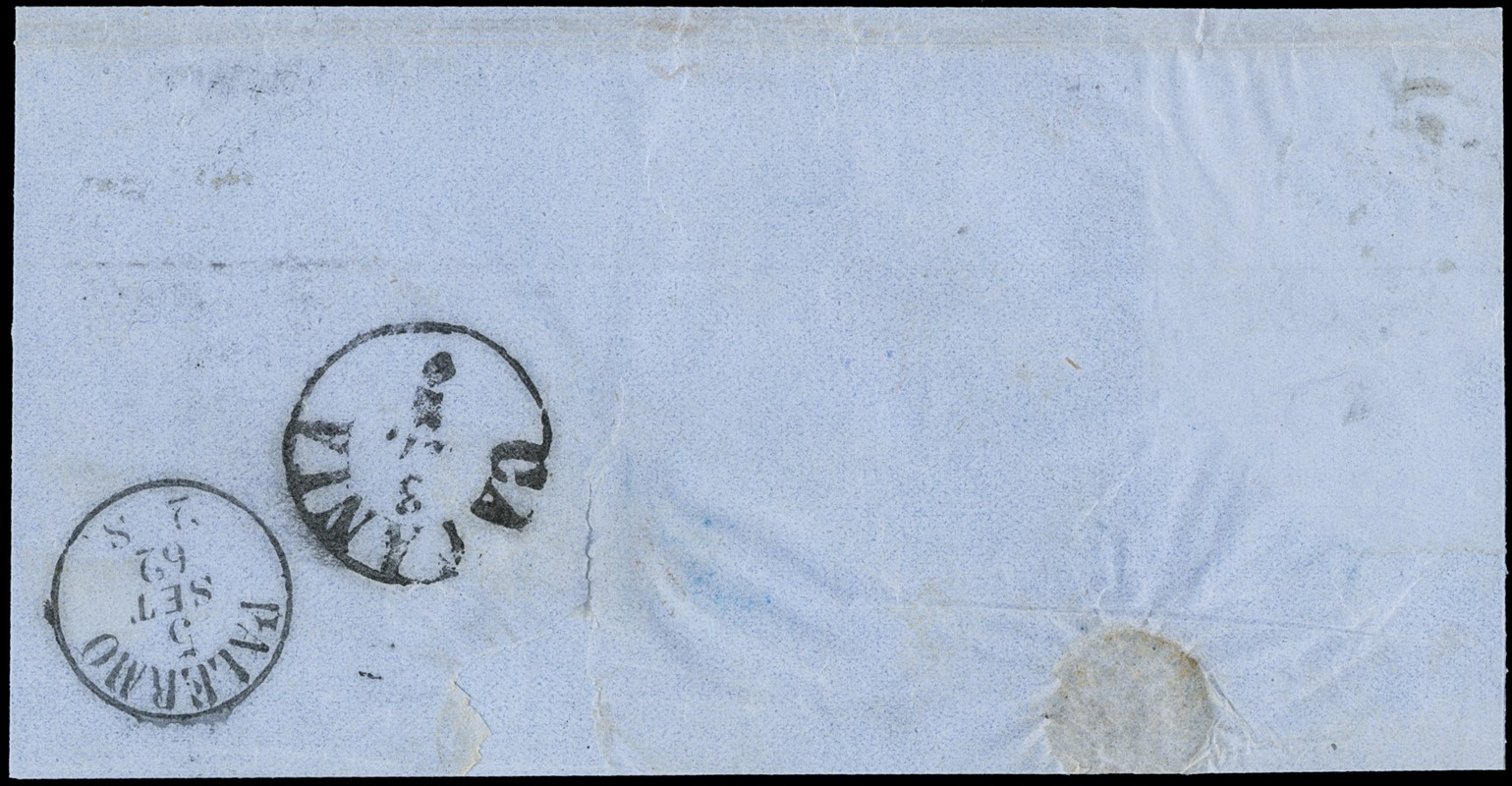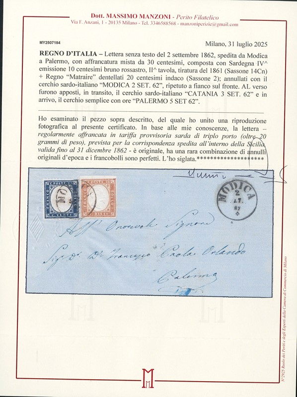 1862 - Sardegna 10c bruno rossastro e Regno d'Italia Matraire 20c indaco, in affrancatura mista da 'MODICA 2 SET 62' a Palermo. CF Manzoni (Sassone 2+Sard.14Cn+pt.12 - Euro 7.400)
