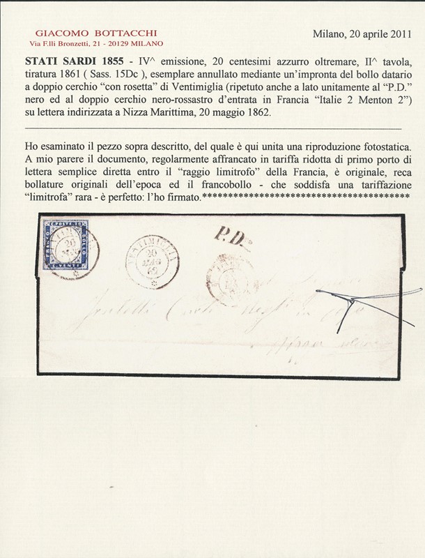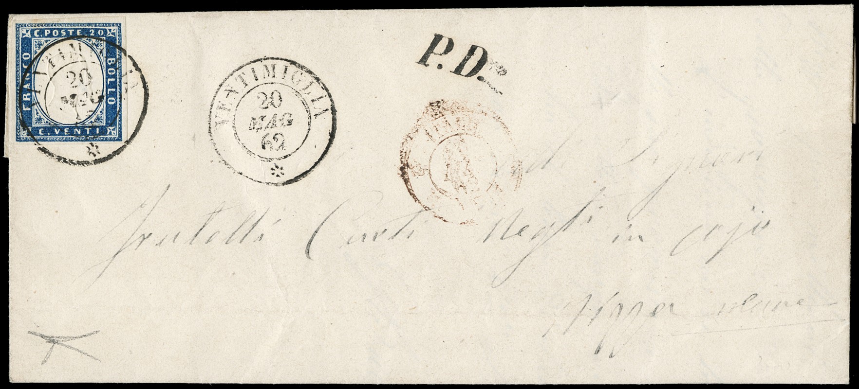 1862 - Sardegna, IV emissione, 20c azzurro oltremare II tav. tir.'61, da 'VENTIMIGLIA 20 MAG 62' a Nizza in tariffa di raggio limitrofo per la Francia. CF Bottacchi (Sassone 15Dc - Euro -)