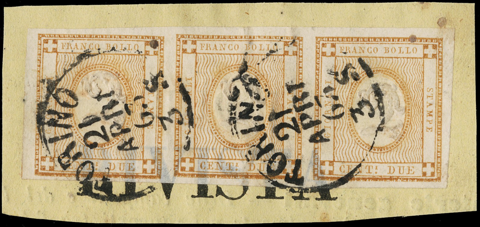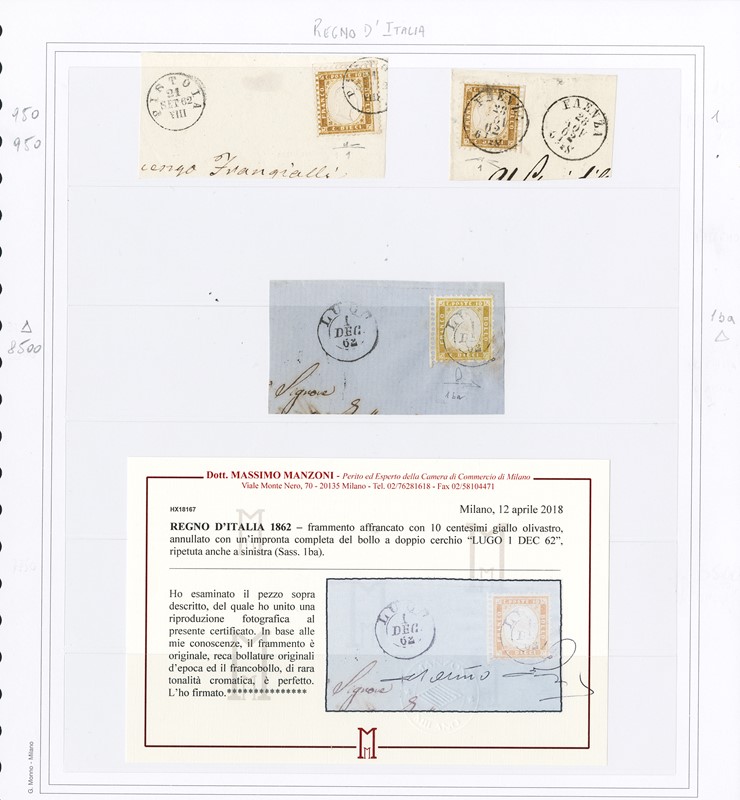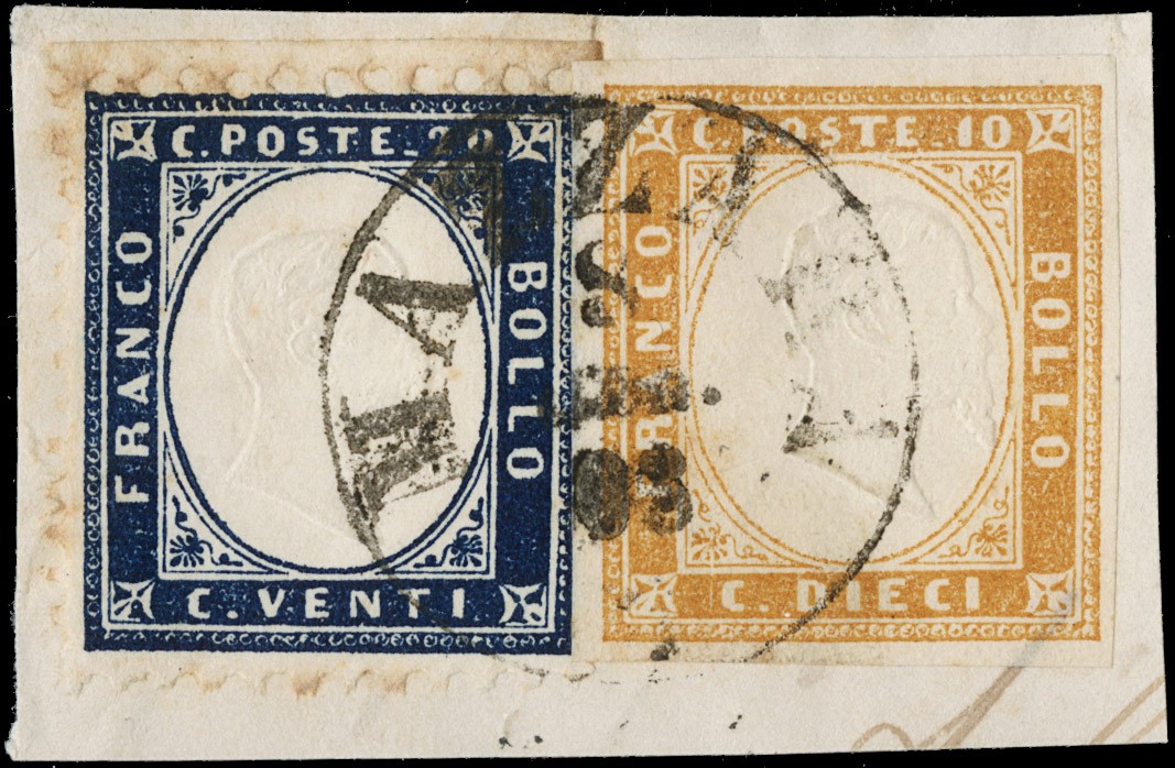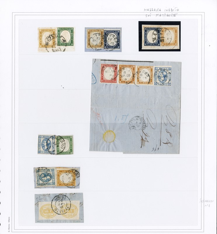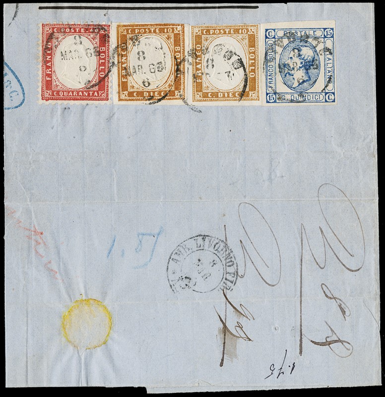 1862/63 - REGNO D'ITALIA: insieme di francobolli su frammento e su lettera. Notate alcune affrancature miste fra le quali un frammento con un 20c dentellato e un 10c di Sardegna IV con annullo di Mazzara, a oggi non quotato sui francobolli d'Italia, e un