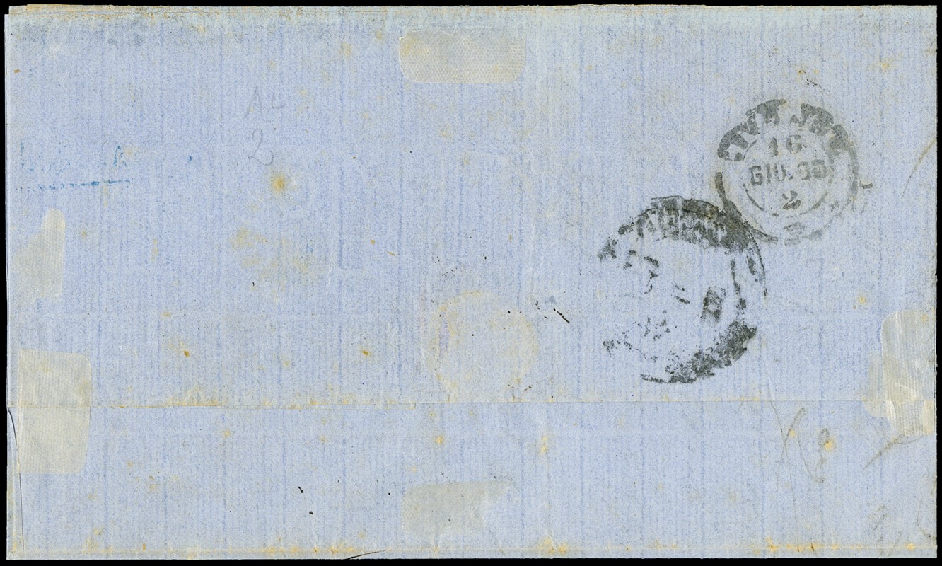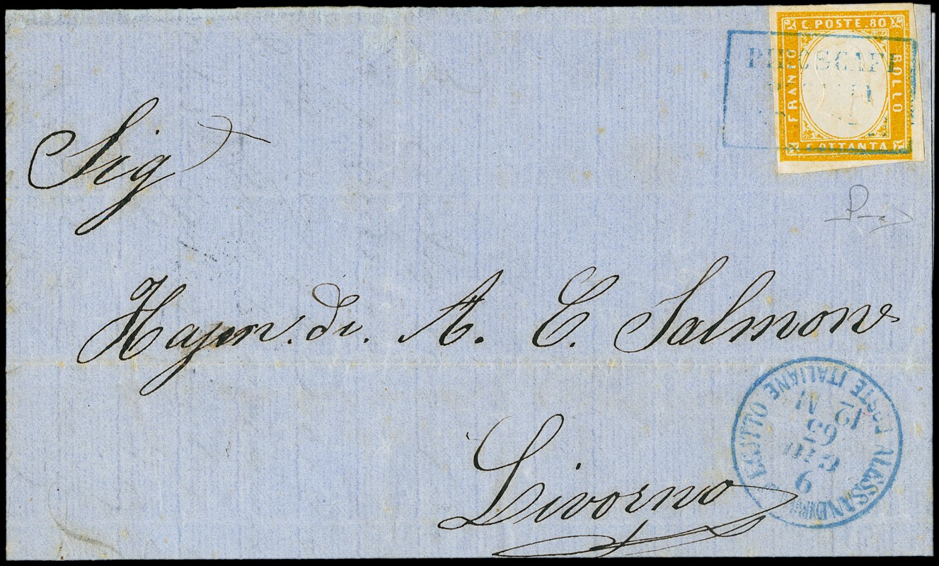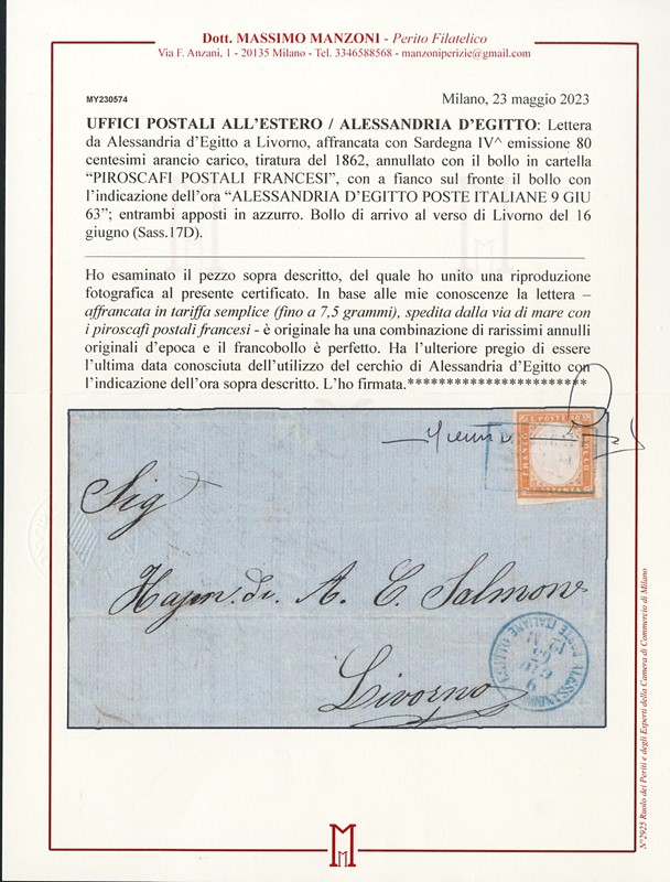 1863 – Sardegna 80c arancio carico annullato 'PIROSCAFI POSTALI FRANCESI' da 'ALESSANDRIA D’EGITTO POSTE ITALIANE 9 GIU 63' entrambi in azzurro, per Livorno. Ultima data nota dell'utilizzo del cerchio di Alessandria d'Egitto con indicazione dell'ora, insieme rarissimo. CF Manzoni (Sassone 17D+pt.R1 - Euro 27.500+ - Zanaria-Serra Euro 12.500+)
