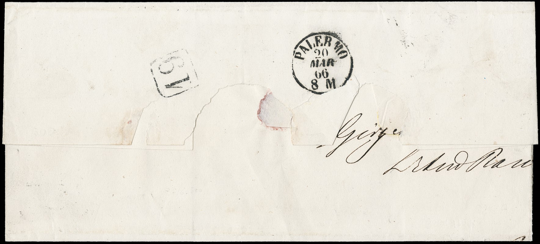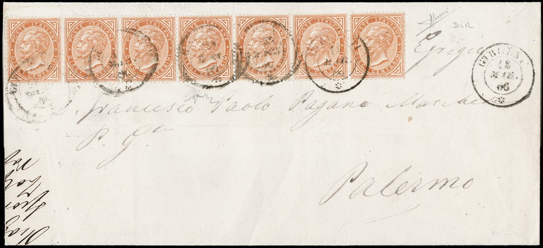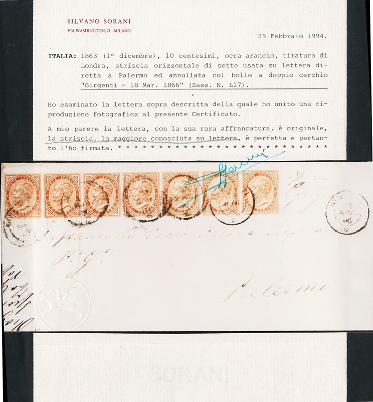 1863 - 10c ocra carminio, DLR Londra, ST7 orizzontale da 'GIRGENTI 18 MAR 66' a Palermo. Massima striscia nota di questo valore su documento. Rara e perfetta. Sigla Chiavarello, CF Sorani (Sassone L17 - stima Euro 19.000)