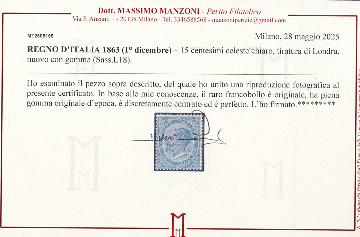 1863 - 15c azzurro, DLR Londra, discreta/buona centratura. Firme A. ed E.Diena, CF Manzoni (Sassone L18 - Euro 5.000+)