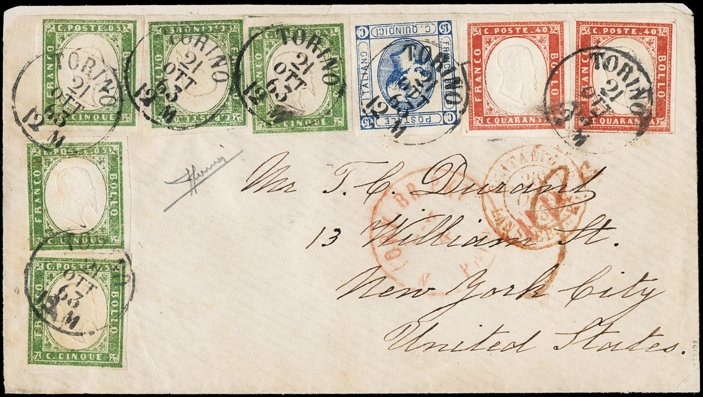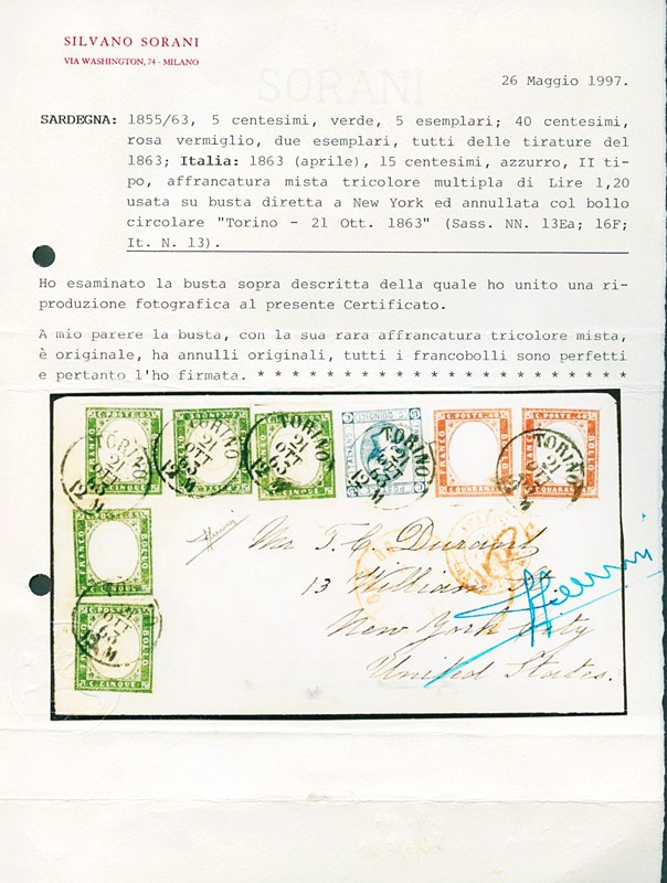 1863 - 15c azzurro litografato, II tipo, con Sardegna IV emissione, 5c verde, cinque esemplari, 40c rosa vermiglio, due esemplari, da 'TORINO 21 OTT 63' per New York. Tutti i francobolli sono perfetti. CF Sorani (Sardegna 13Ea+16F+Italia13 - Euro -)