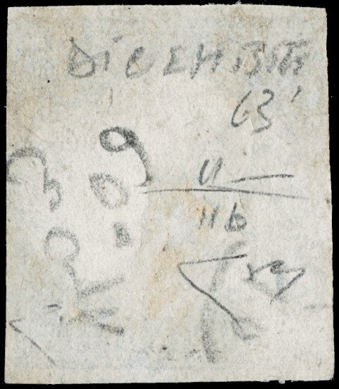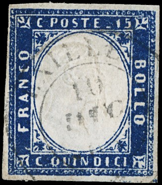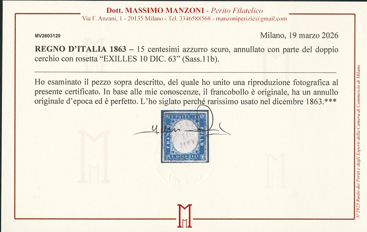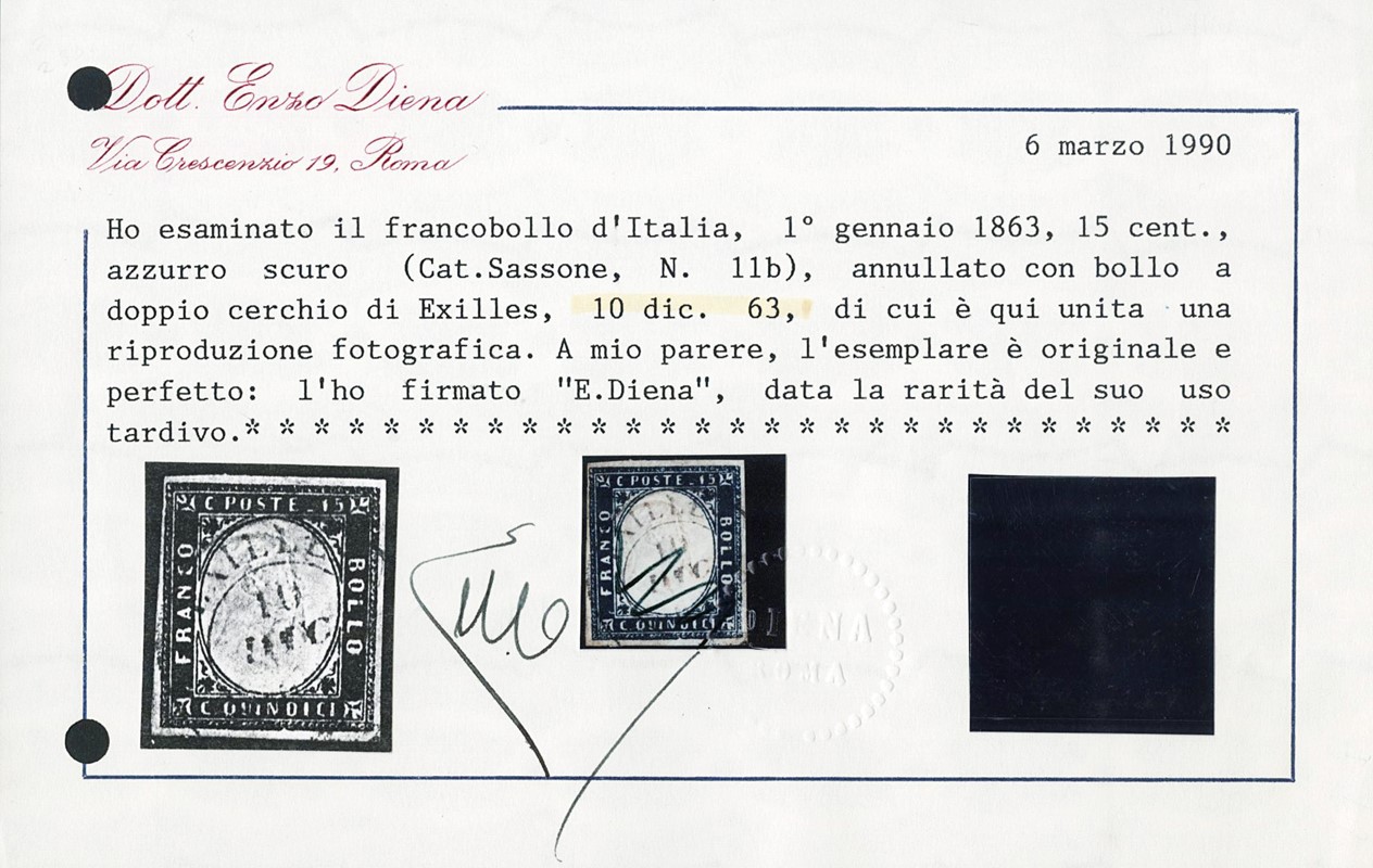 1863 - 15c azzurro scuro, annullato con parte del doppio cerchio con rosetta 'EXILLES 10 DICEMBRE 1863'. Rarissimo uso tardivo di questo francobollo. CF E.Diena e Manzoni (Sassone 11b - Euro -)