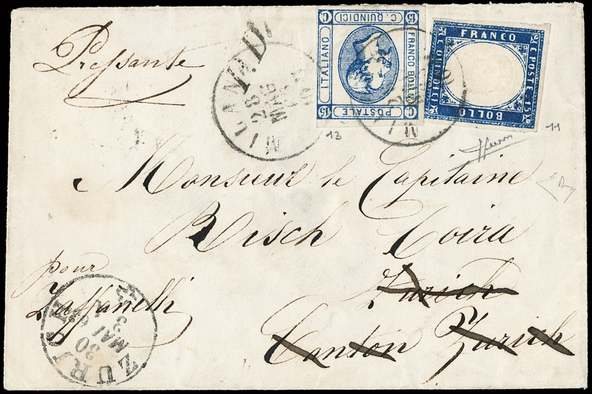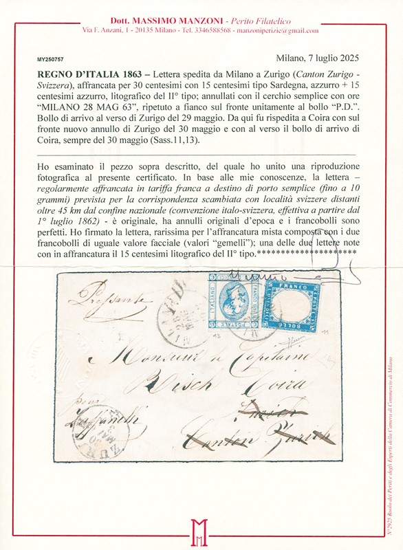 1863 - 15c azzurro tipo Sardegna in affrancatura mista con 15c azzurro litografico II tipo, con francobolli perfetti. Zanaria Serra: 'due soli casi noti'; Sassone: 'rarissima la combinazione con il litografico II tipo n.13'. Firme E.Diena e Sorani, CF Manzoni (Sassone 11 - Zanaria-Serra 2004 Euro 25.000)
