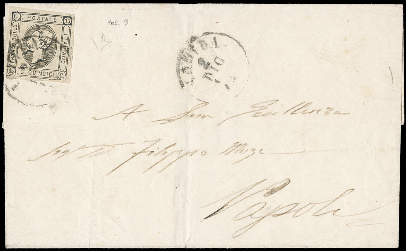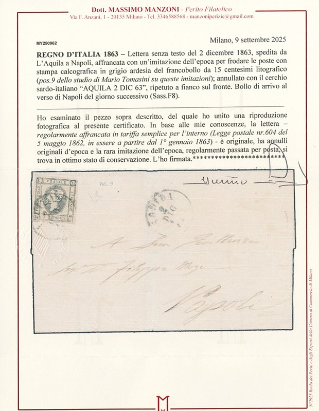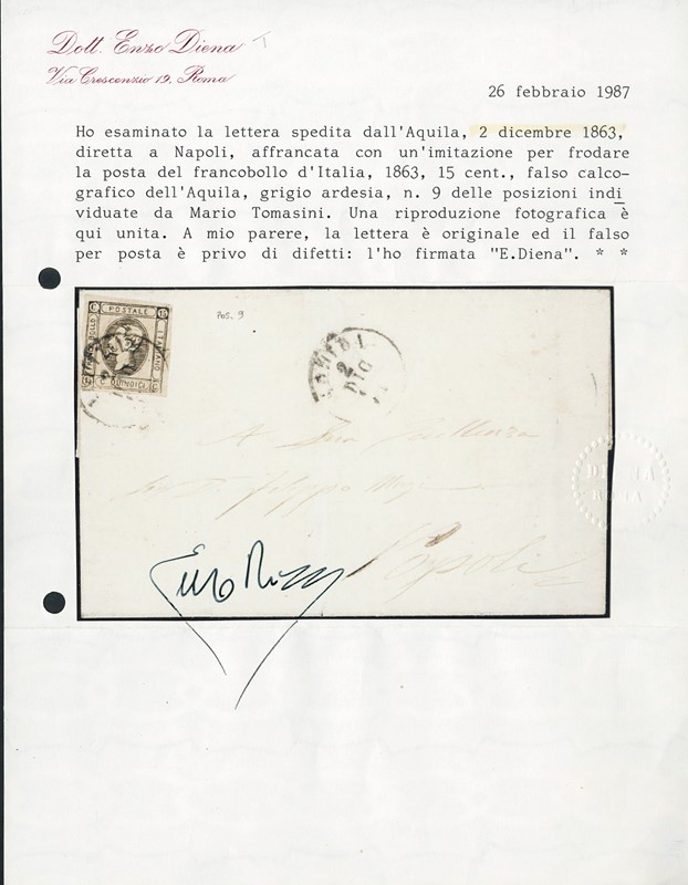 1863 - 15c grigio ardesia, imitazione per frodare la posta 'dell'Aquila' del 15c litografico (pos.9 dello studio di Mario Tomasini), da 'L'AQUILA 2 DIC 63' a Napoli. Rarissima. CF E.Diena e Manzoni (Sassone F8 - Euro 65.000)