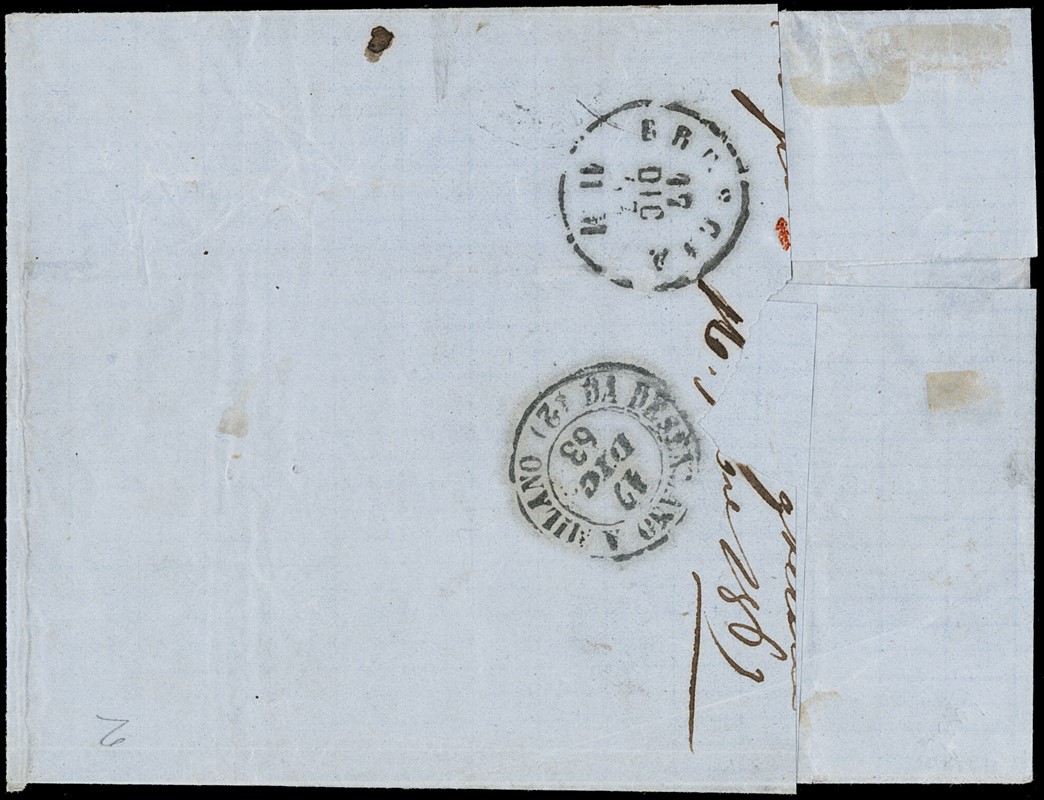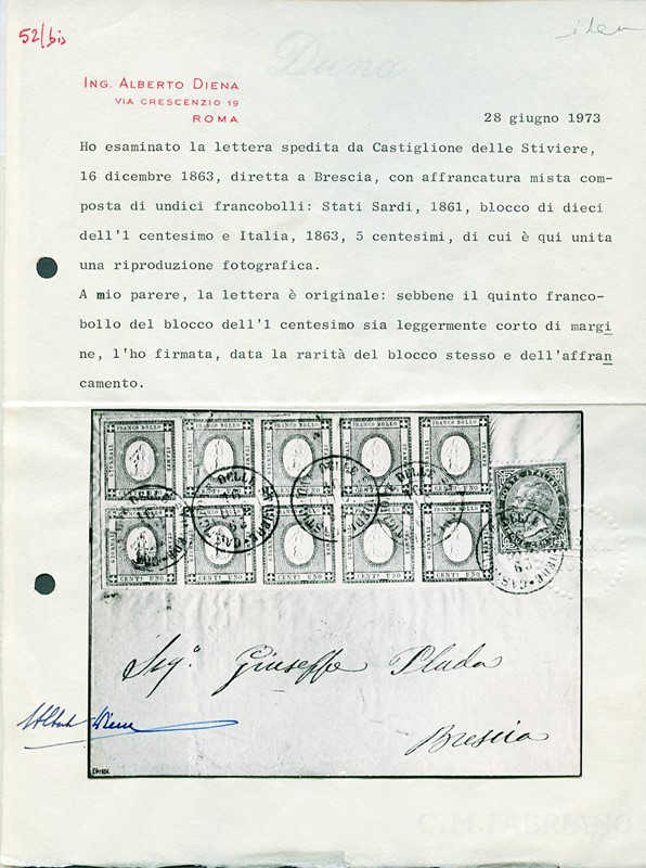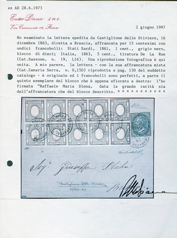 1863 - 1c grigio nero, BL10 (il quinto superiore destro a filo, tutti gli altri con ottimi margini) e DLR Londra 5c grigio verde, a comporre la tariffa da 15c da 'CASTIGLIONE DELLE STIVIERE 16 DIC 63' a Brescia. Affrancatura mista di grande rarita' in eccellenti condizioni. Firma Giulio Bolaffi, CF A. e R.Diena (Sassone 19+L16 - Zanaria-Serra 2004 Euro 35.000)