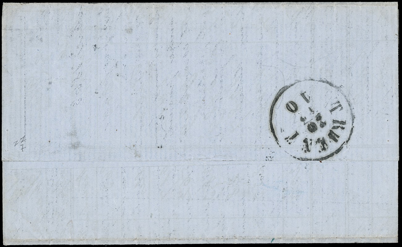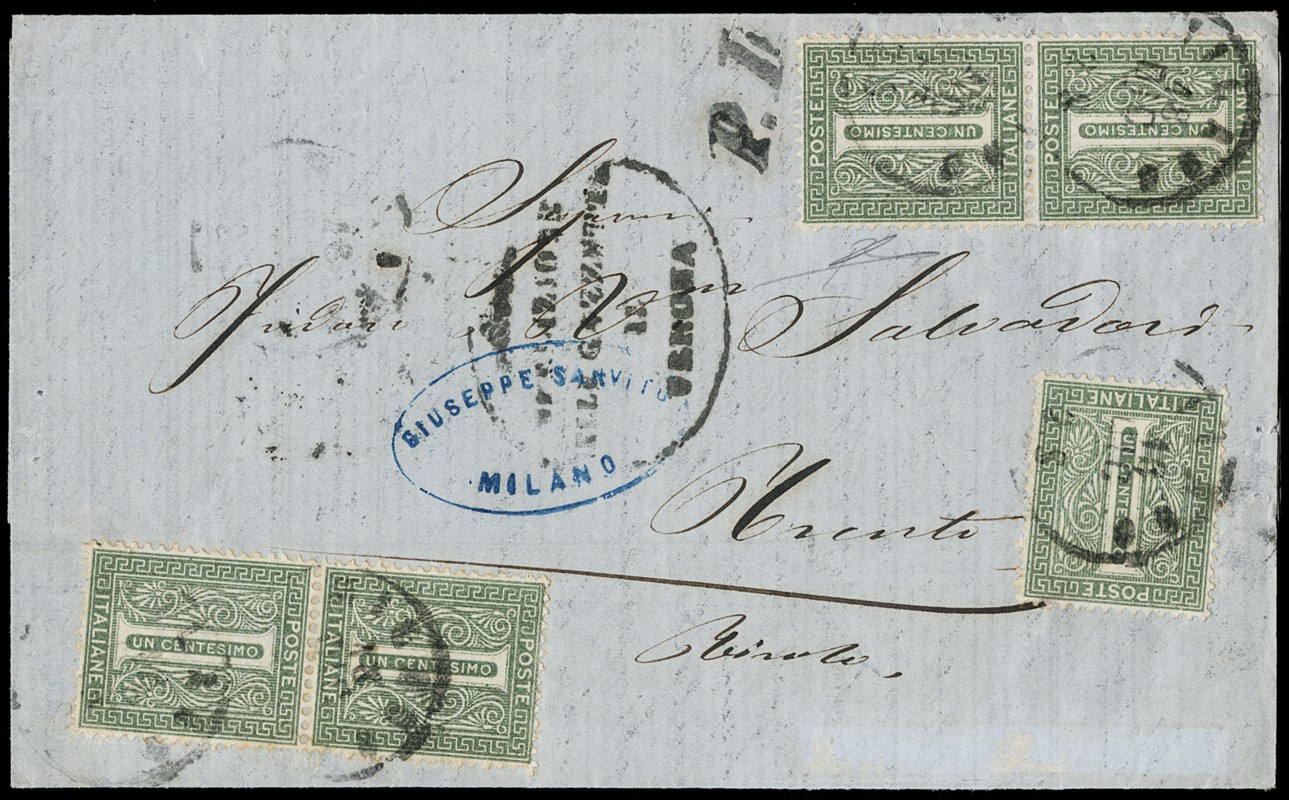1863 - 1c verde grigio chiaro DLR (LO), due coppie verticali e singolo su circolare da 'MILANO 18 DIC 63' a Trento. Raro stampato diretto in Austria, spedito nel dicembre 1863. CF Diena (Sassone L14)