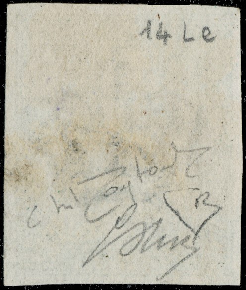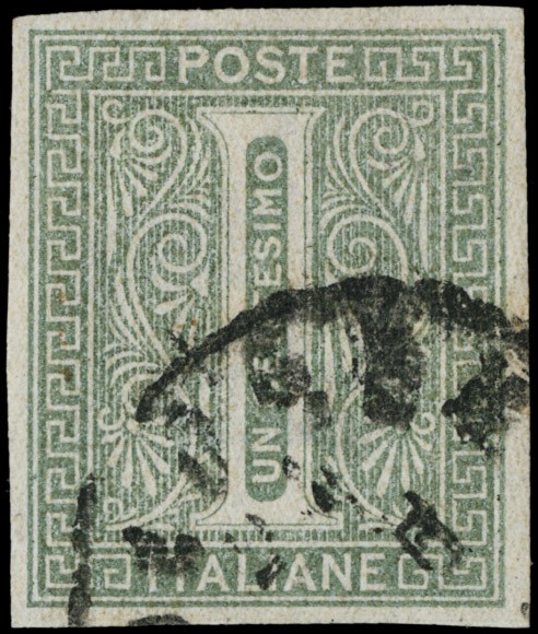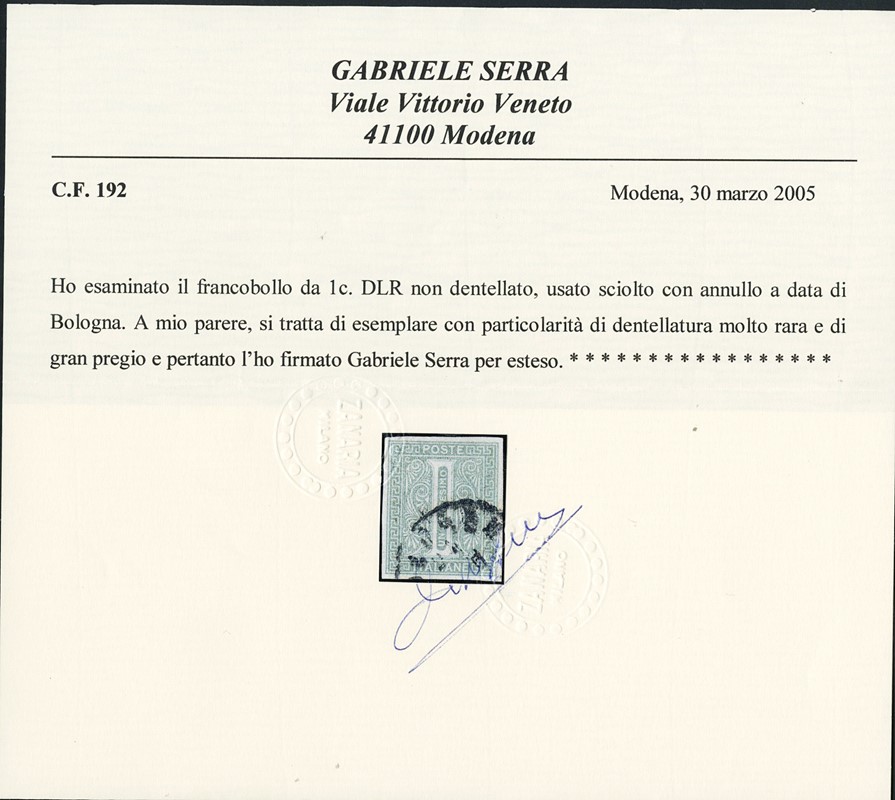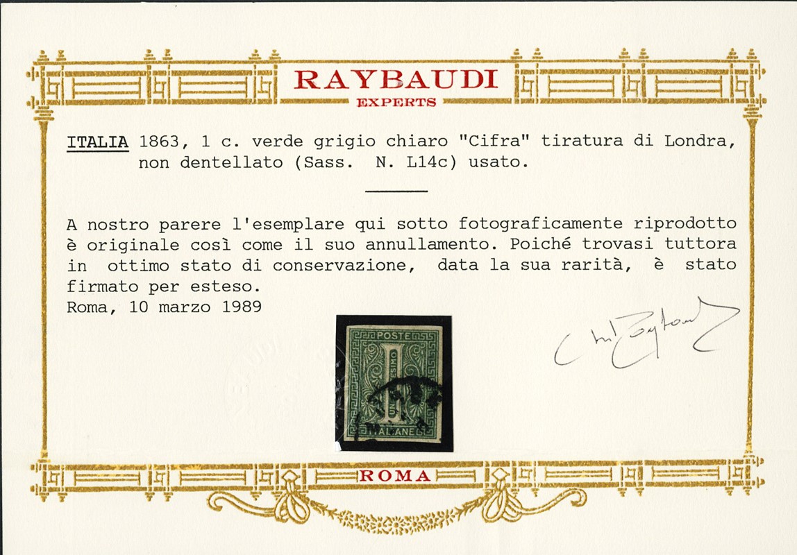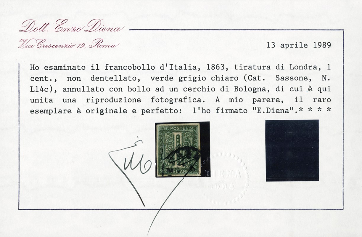 1863 - 1c verde grigio chiaro, DLR Londra, non dentellato e ben marginato, usato a Bologna. Raro, noti solo nove esemplari e tre coppie. Firma Guglielmo Oliva, CF Raybaudi, E.Diena e Gabriele Serra (Sassone L14c - Euro 18.000)