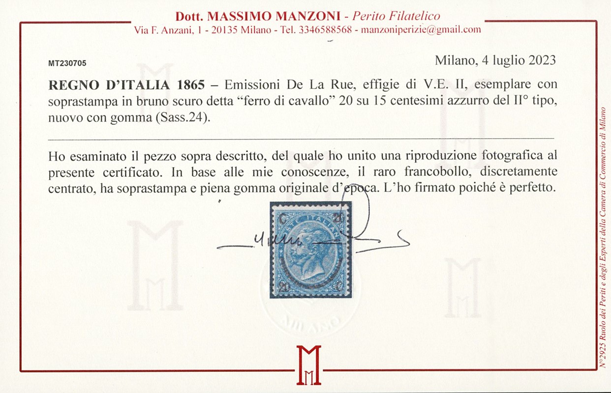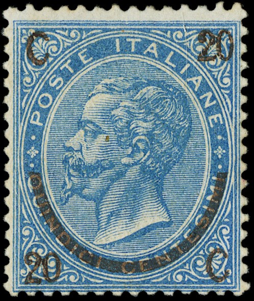 1863 - 20c su 15c azzurro, ferro di cavallo II tipo, discreta centratura. Ex Seregni. Firme A.Diena, Fiecchi e Oliva, CF Manzoni (Sassone 24 - Euro 22.500)