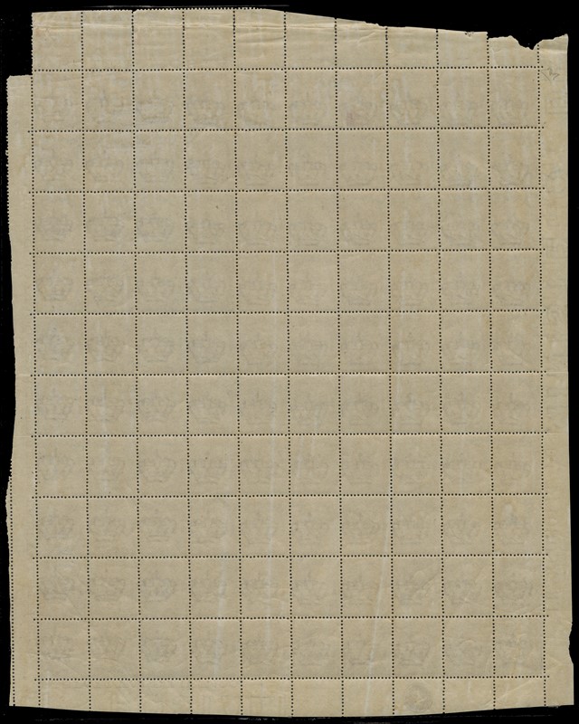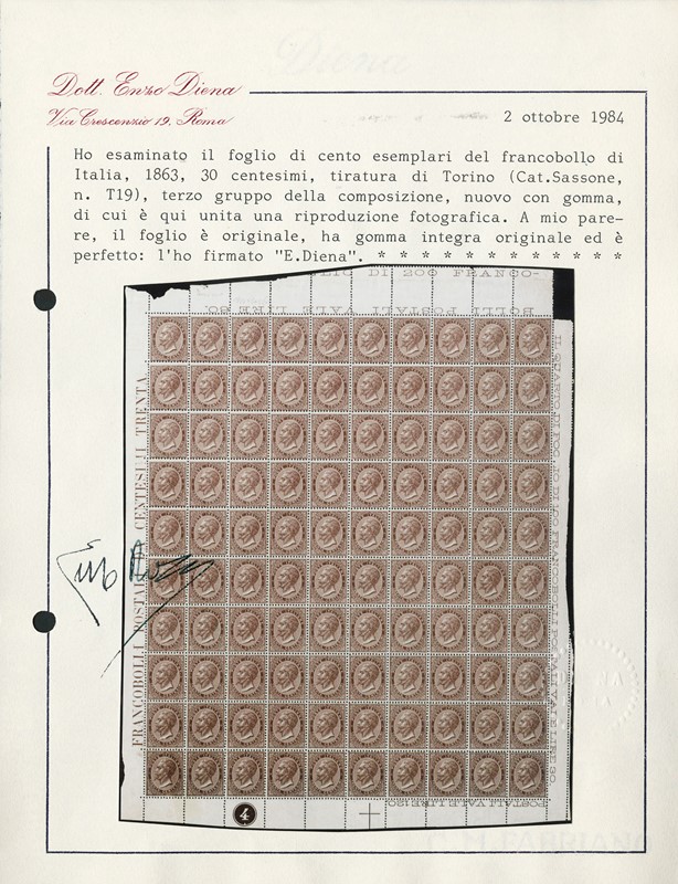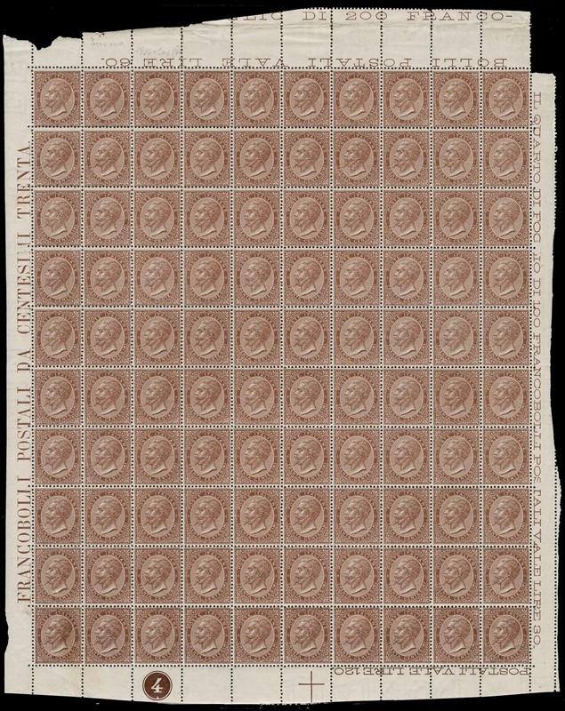 1863 - 30c bruno castano, DLR Torino, foglio completo di 100 esemplari con numero di tavola '4' in cerchio. Discreta centratura, raro. CF E.Diena (Sassone T19 - Euro 5.000+)