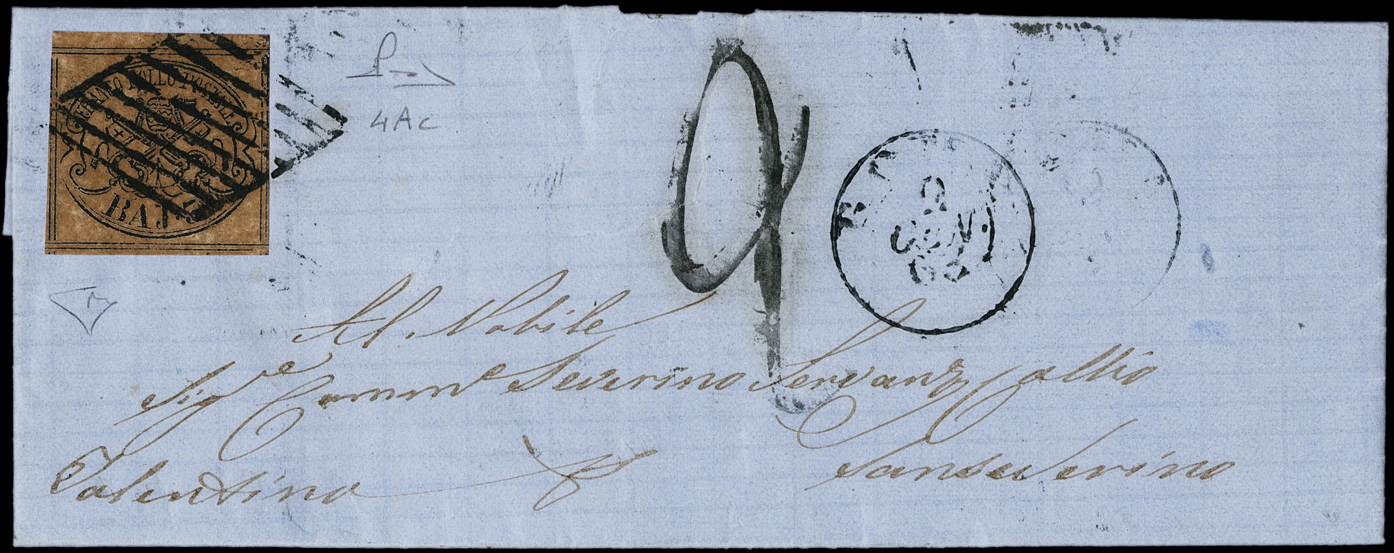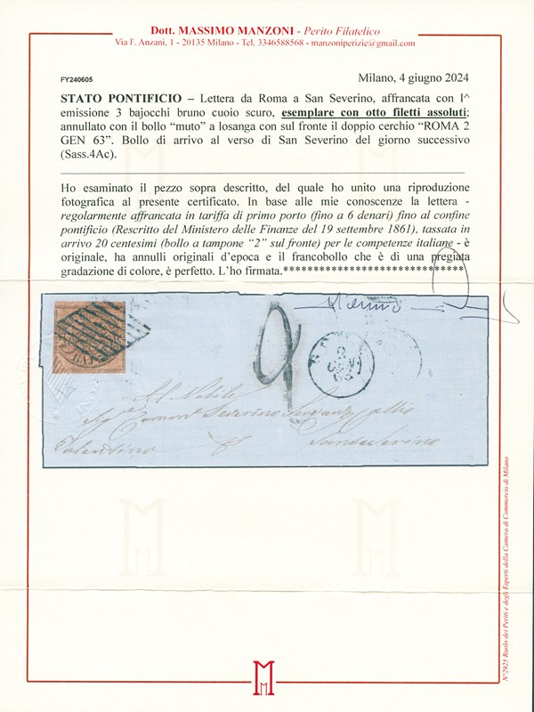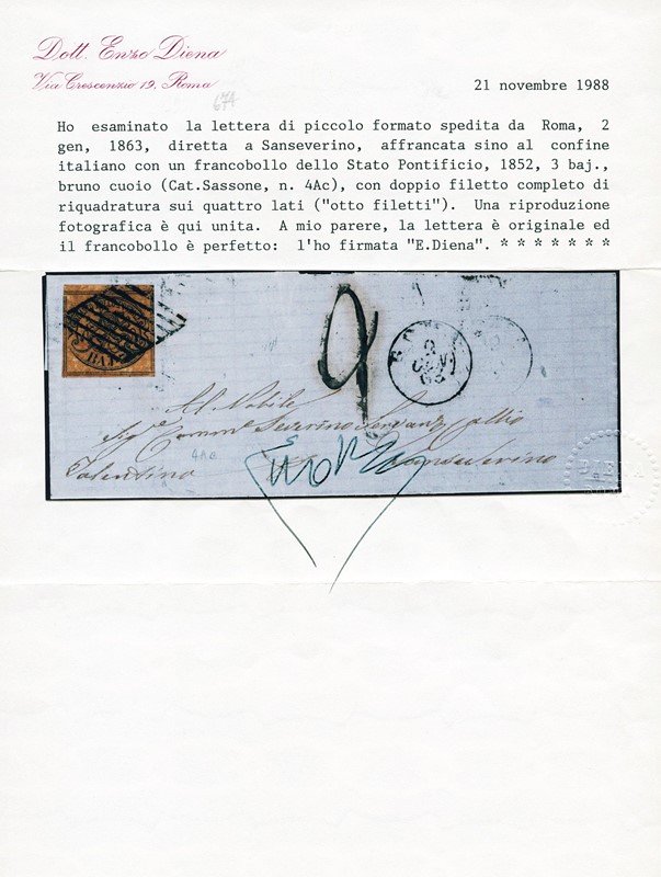 1863 - 3b bruno cuoio scuro, esemplare 'otto filetti' da 'ROMA 2 GEN 63' a San Severino. Splendida e rara, CF E.Diena e Manzoni (Sassone 4Ac - circa Euro 18.000)