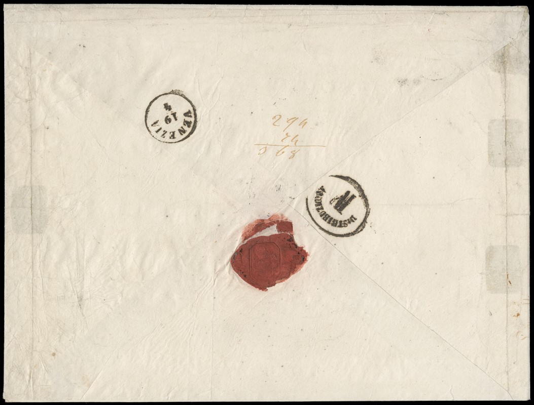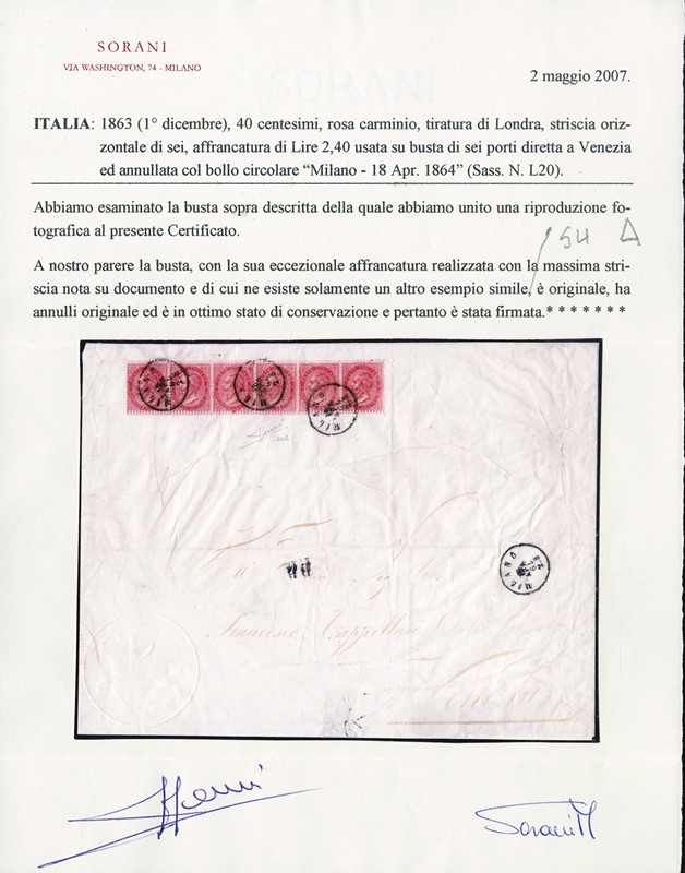 1863 - 40c rosa carminio, DLR Londra, ST6 orizzontale su involucro da 'MILANO 19 APR 64' a Venezia. Massima striscia nota su documento; delle due note questa e' l'unica perfetta. CF Sorani (Sassone L20 - Euro -)