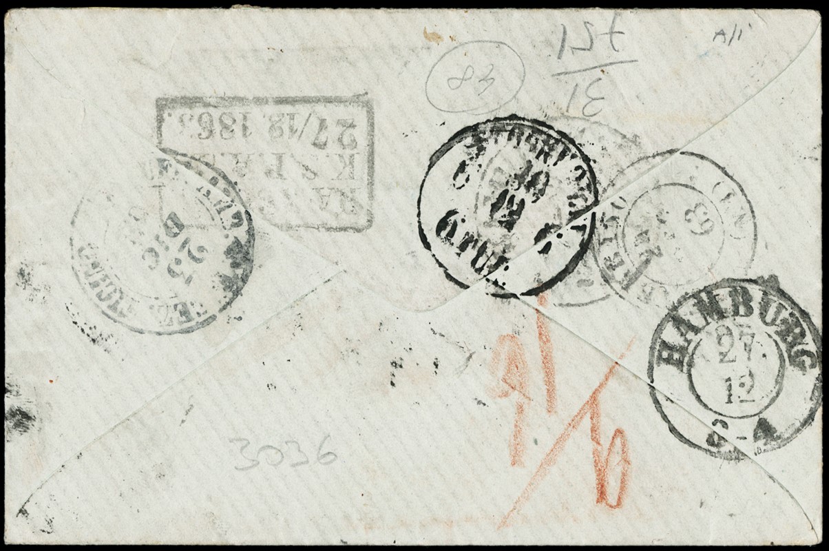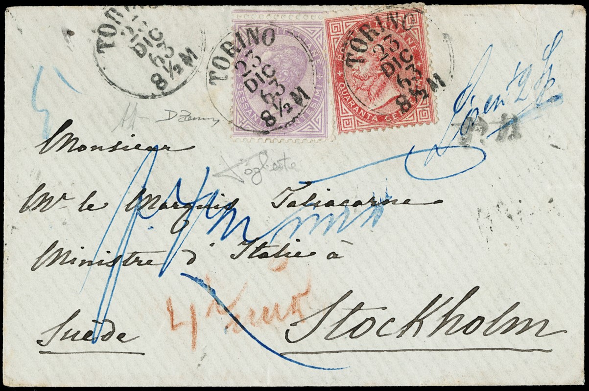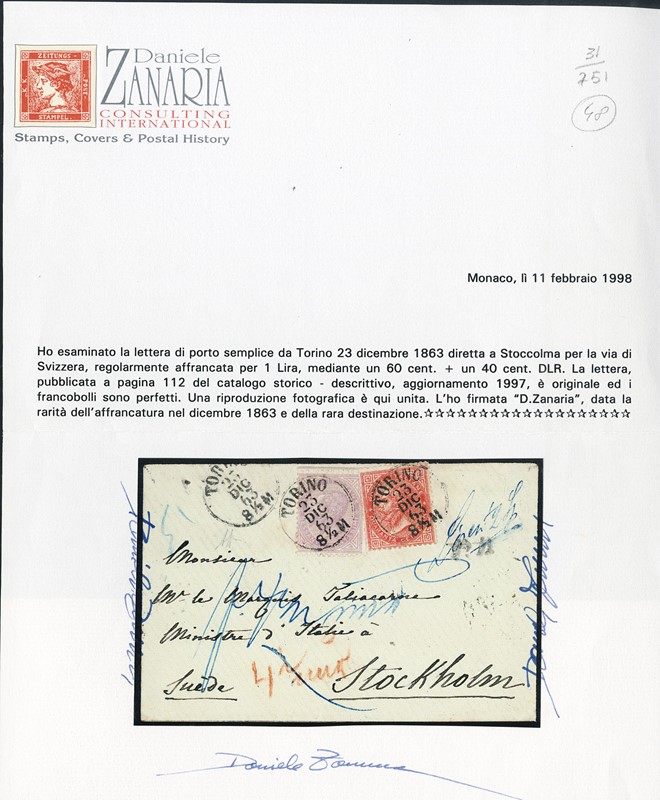 1863 - 40c rosa carminio e 60c lilla chiaro, entrambi DLR (LO), da 'TORINO 23 DICEMBRE 1863' a Stoccolma, via di Svizzera. Rara affrancatura e destinazione del dicembre 1863. Busta pubblicata a pagina 112 del catalogo storico-descrittivo Zanaria/Serra, aggiornamento 1997. CF Daniele Zanaria (Sassone L2+,L21 - Euro 7.750++)