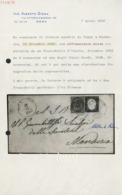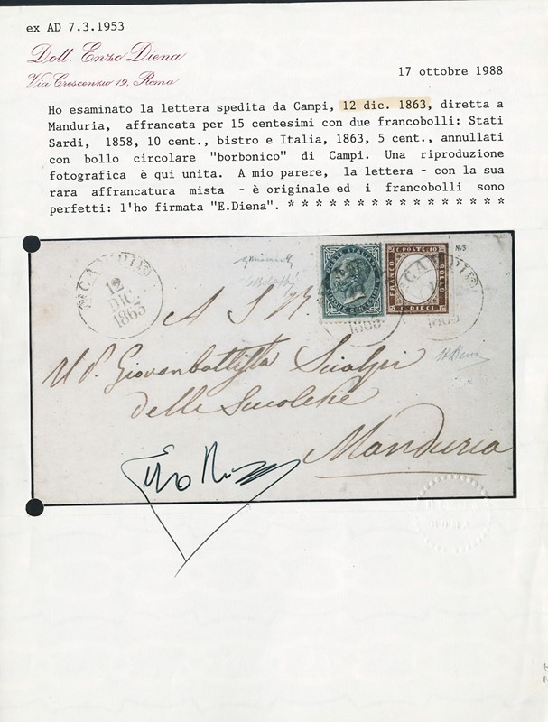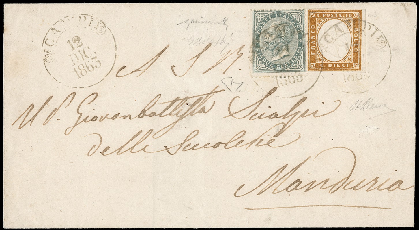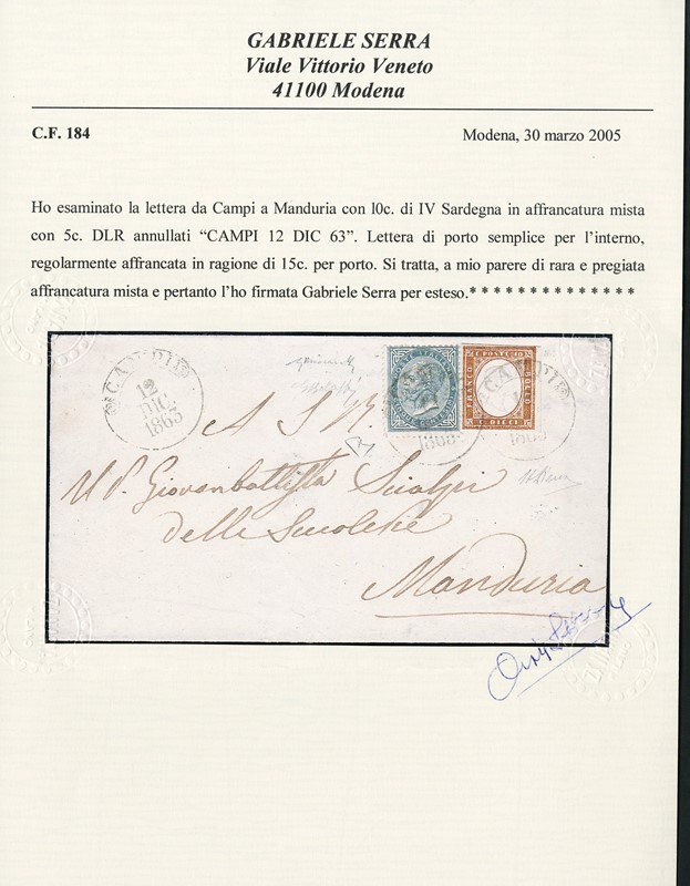 1863 - 5c grigio verde, DLR Londra, in affrancatura mista con Sardegna 10c bistro scuro II tav, tir.'63, da 'CAMPI 12 DIC 63' a Manduria. Firme Chiavarello, Giulio Bolaffi, CF A.Diena, E.Diena e Gabriele Serra (Sassone L16, Sard. 14Eb - Euro 15.000)