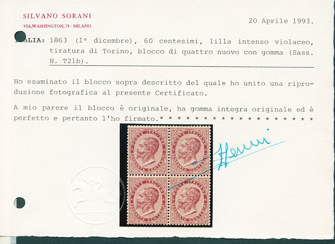 1863 - 60 lilla intenso violaceo BL4 SL, discreta/buona centratura. CF Sorani (Sassone T21b - Euro 2.200)