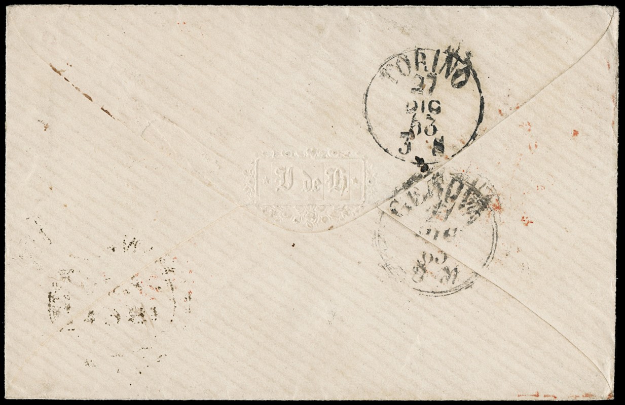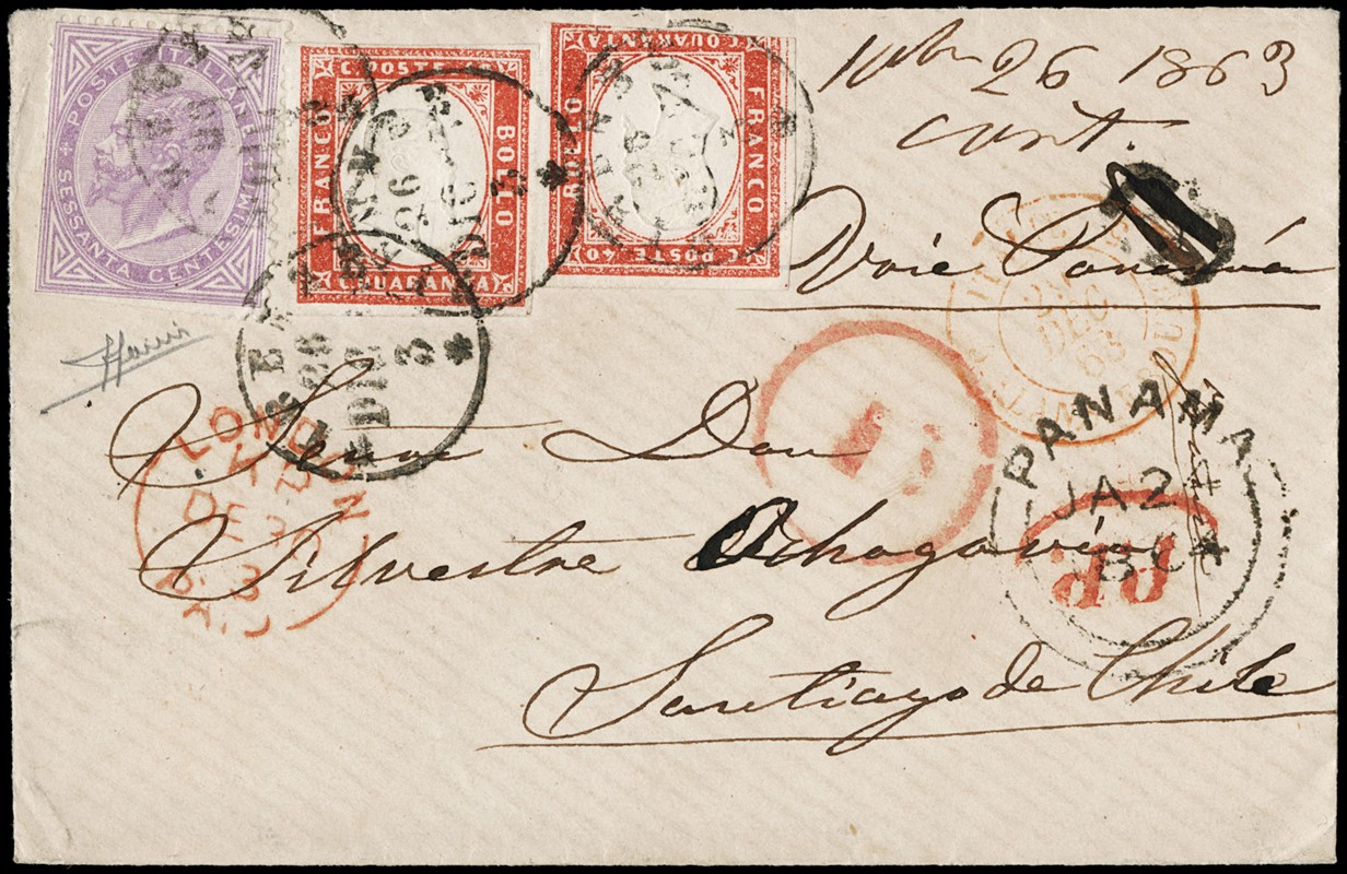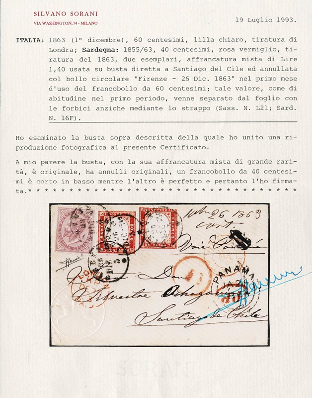 1863 - 60c lilla chiaro, DLR Londra, con Sardegna 40c rosa vermiglio, tir.'63, due esemplari, in affrancatura mista da L1,40 da 'FIRENZE 26 DIC 63' per Santiago del Cile, con passaggio a 'PANAMA JA 24 1864'. Il 60c separato con forbici, come abitudine nel primo periodo d'uso di questi francobolli, insieme comunque splendido e raro, impreziosito dall'utilizzo del 60c. CF Sorani (Sassone L21+Sard.16F - Euro - )
