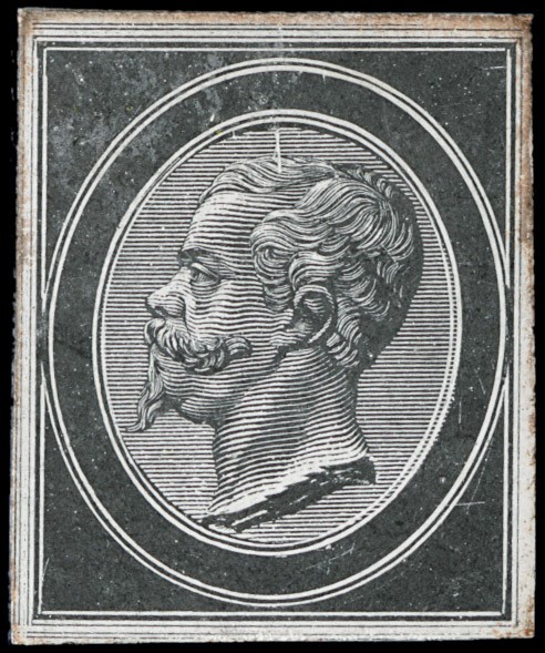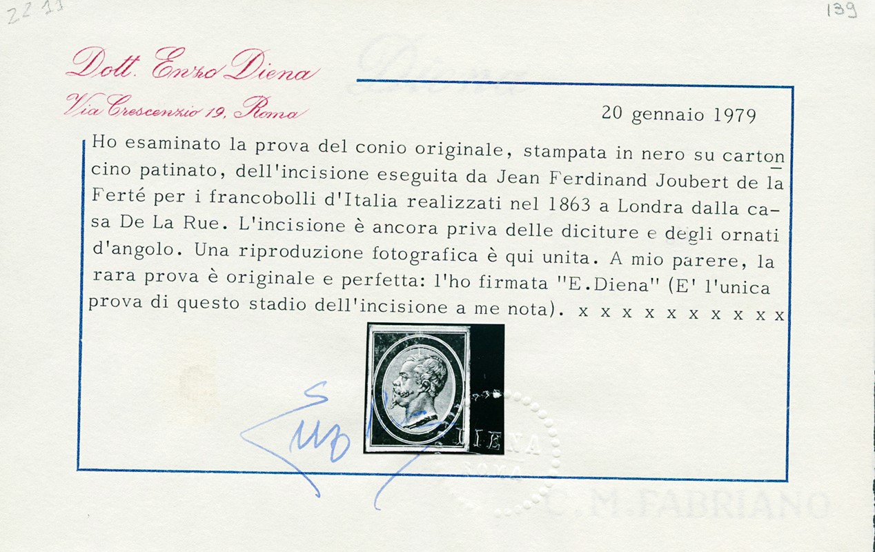 1863 - De La Rue, prova del conio originale, stampata su cartoncino patinato in nero, con la cornice ma ancora priva delle diciture e degli ornati d'angolo, raffigurante il profilo di Vittorio Emanuele II, incisa da Jean Ferdinand Jambert de la Ferte'. Unica prova di questo stadio nota. Dettagliato CF E.Diena