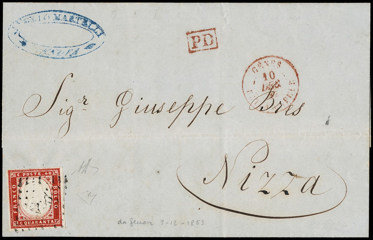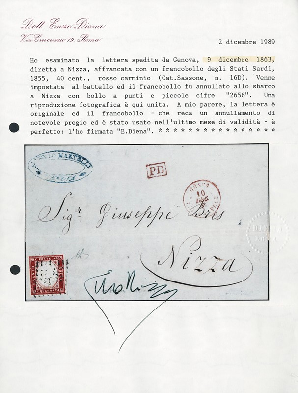 1863 - Sardegna IV em. 40c rosso carminio, tir.'61, da 'GENOVA 9 DICEMBRE 1863' a Nizza; annullato con il bollo numerale a punti con piccole cifre '2656'. Rara combinazione sia per l'uso nell'ultimo mese di validita' dei francobolli sardi sia per la pregiata combinazione di annulli. Firma A.Diena, CF E.Diena (Sassone 16D+pt.11 - Euro 4.200++)