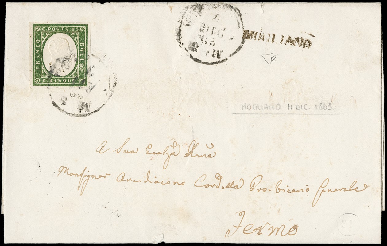 1863 - Sardegna IV emissione, 5c verde cupo, IV tav. tir.'63, da 'MOGLIANO' a Fermo, il 4 dicembre 1863. Raro uso per il distretto nell'ultimo mese di validita' della IV emissione. Sigla E.Diena (Sassone Sardegna 13E - Euro -)