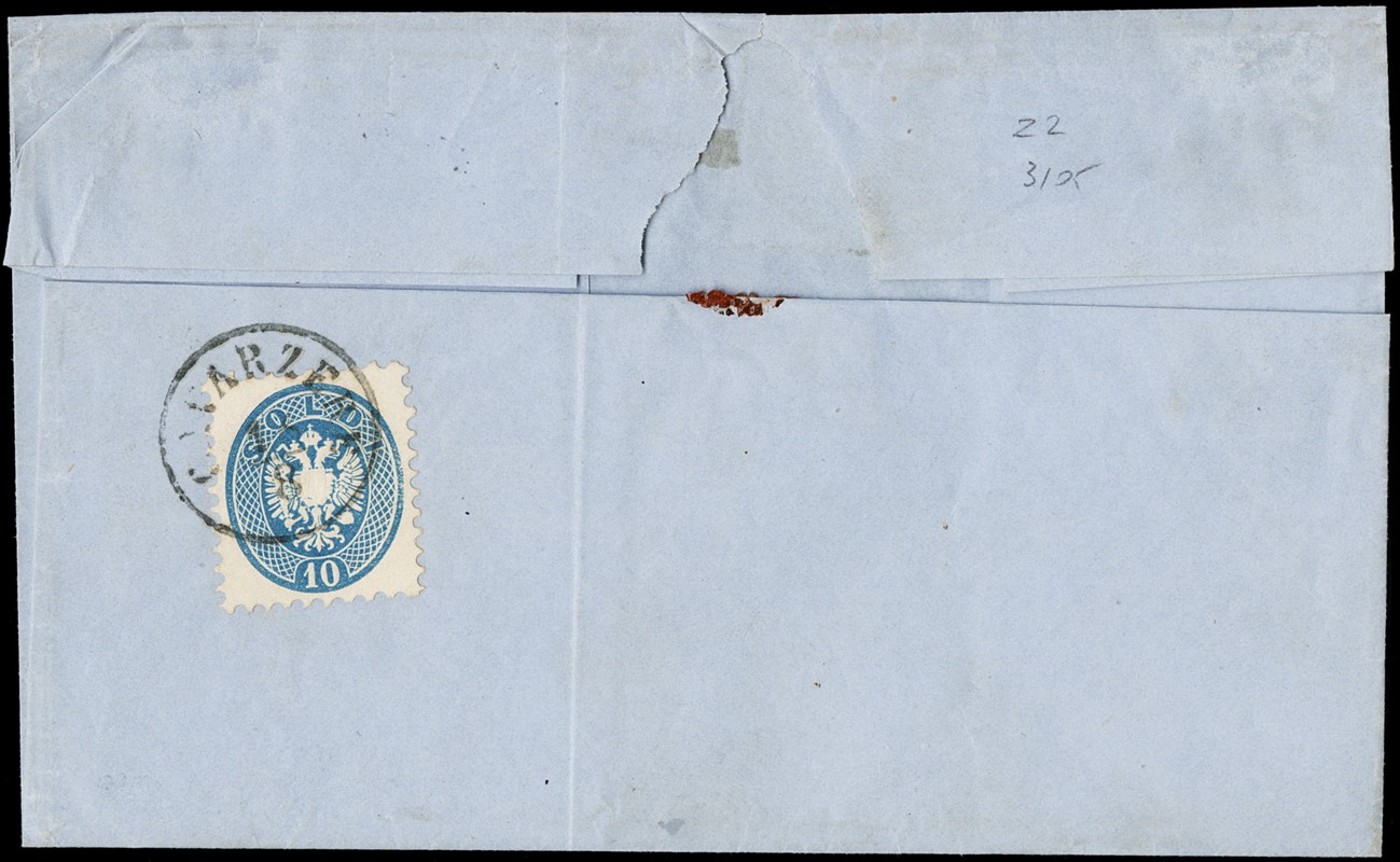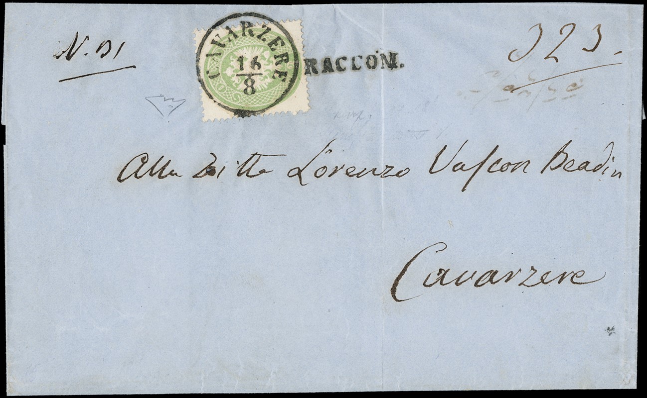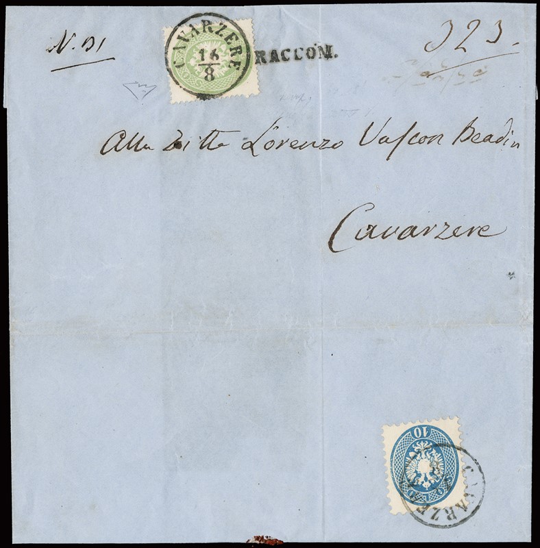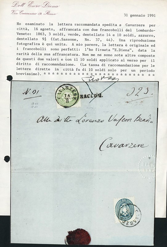 1863/4 - IV emissione 3s verde su raccomandata (lineare 'RACCOM.' sulla soprascritta) da 'CAVARZERE 16/8' per citta'. Al verso 10s azzurro V emissione per il diritto di raccomandazione, che fu di 10s per citta' solo per un brevissimo periodo. Interessantissima, CF E.Diena (Sassone 37+44+pt.6 - Euro -)