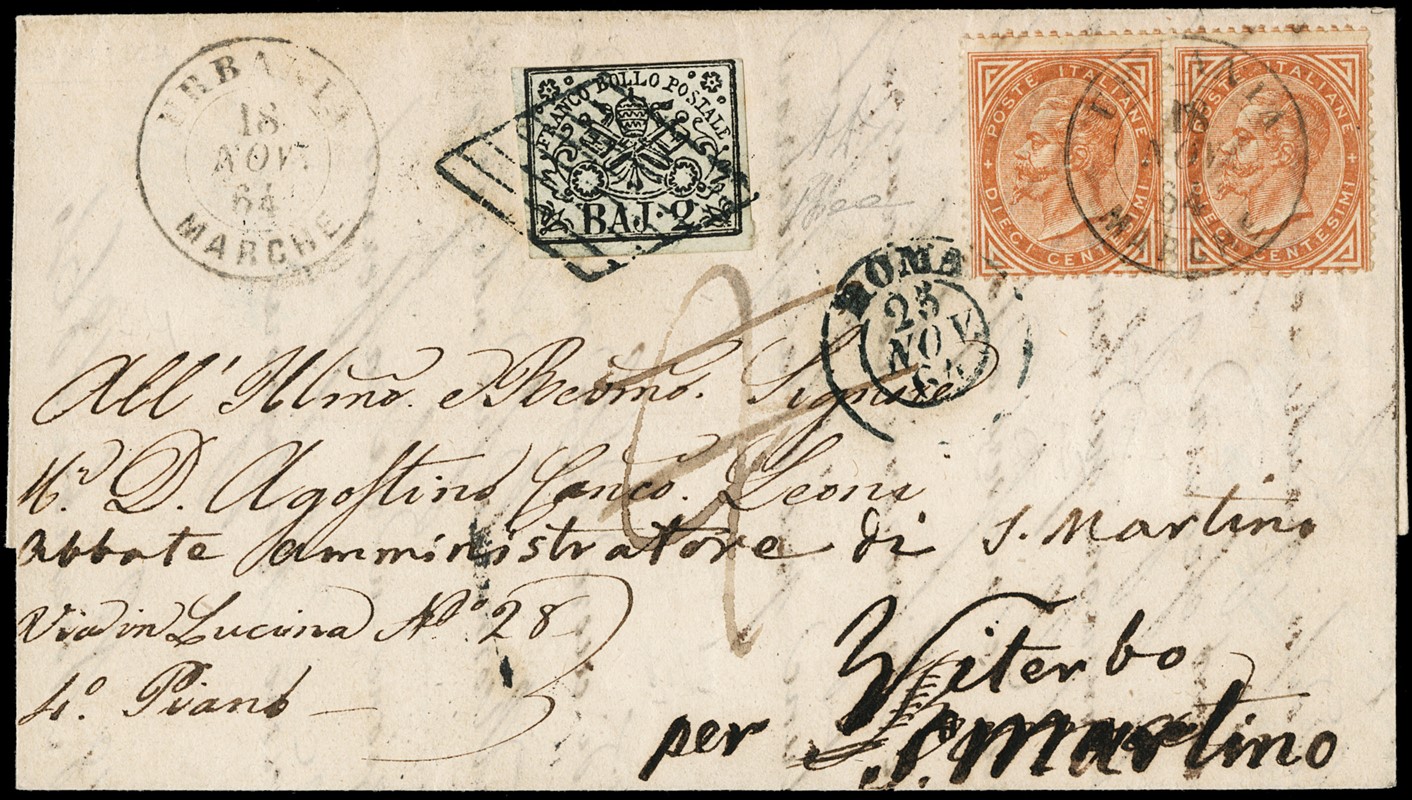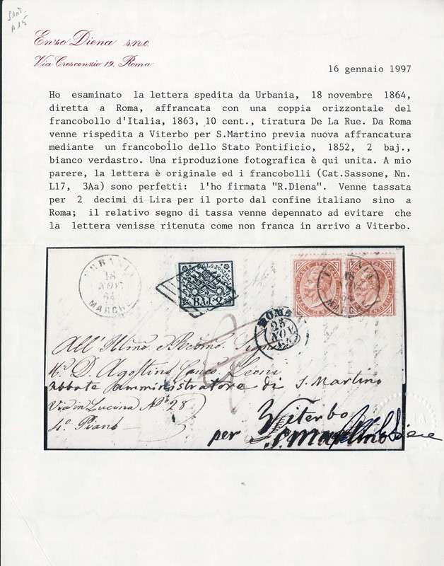 1864 - Regno d'Italia 10c ocra arancio DLR (LO), coppia orizzontale, da 'URBANIA 18 NOV 64' a Roma, rispedita a Viterbo per S.Martino con Pontificio 2b bianco verdastro, annullato a griglia. Interessante mista di rispedizione. Sigla A.Diena, CF R.Diena (Sassone L17+Pontificio 3Aa - Euro - )