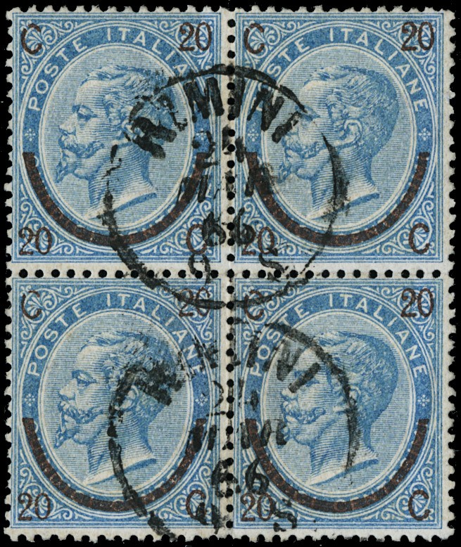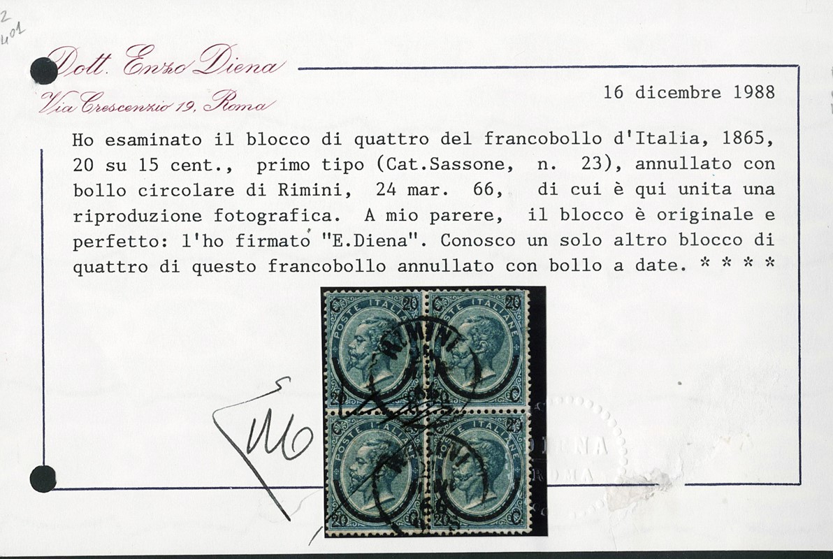 1865 - 20 su 15c celeste chiaro I tipo BL4 annullato due volte con il bollo circolare 'RIMINI 24 MAR 66'. Perfetto e molto raro, uno dei due BL4 noti con bollo a data. CF E.Diena (Sassone 23 - Euro 8.400+)