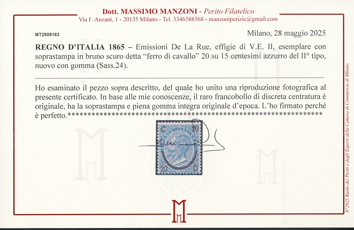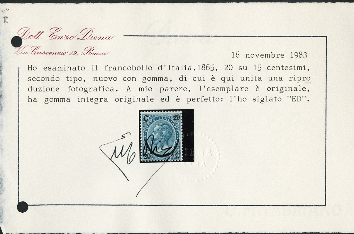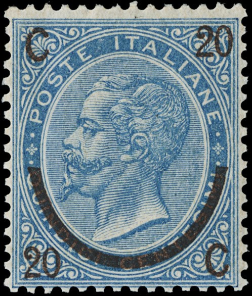 1865 - 20c su 15c azzurro, ferro di cavallo II tipo, SL, discreta/buona centratura. CF E.Diena e Manzoni (Sassone 24 - Euro 45.000)