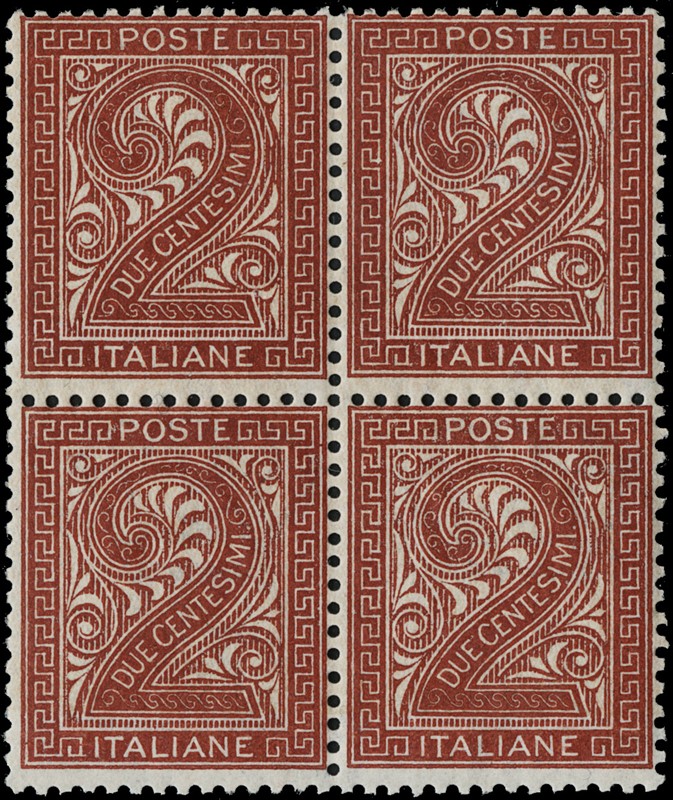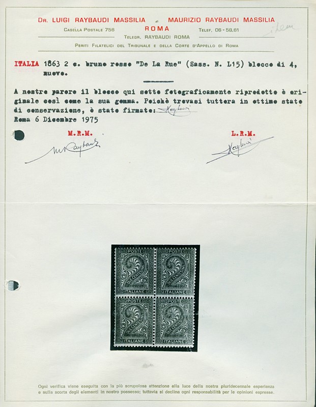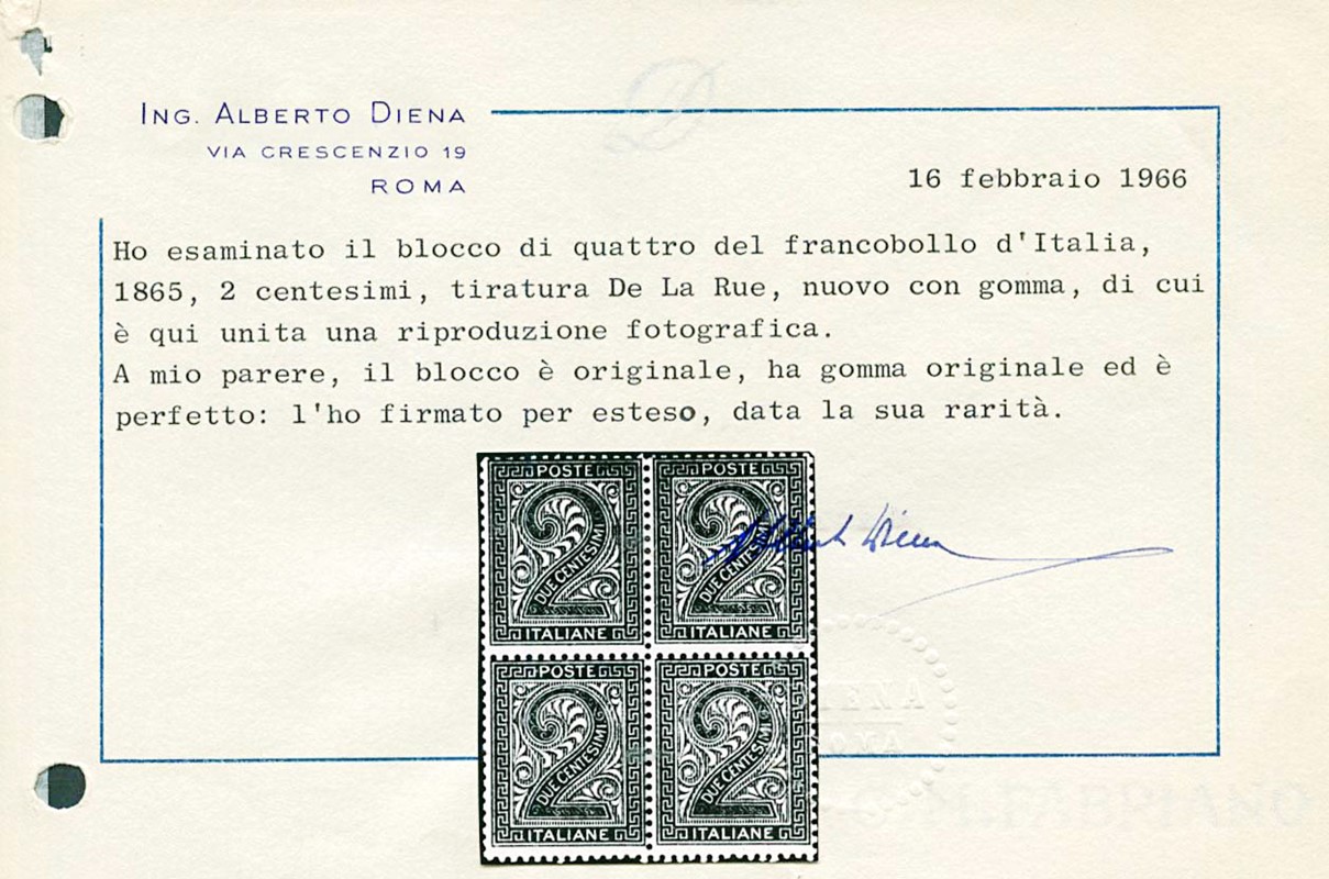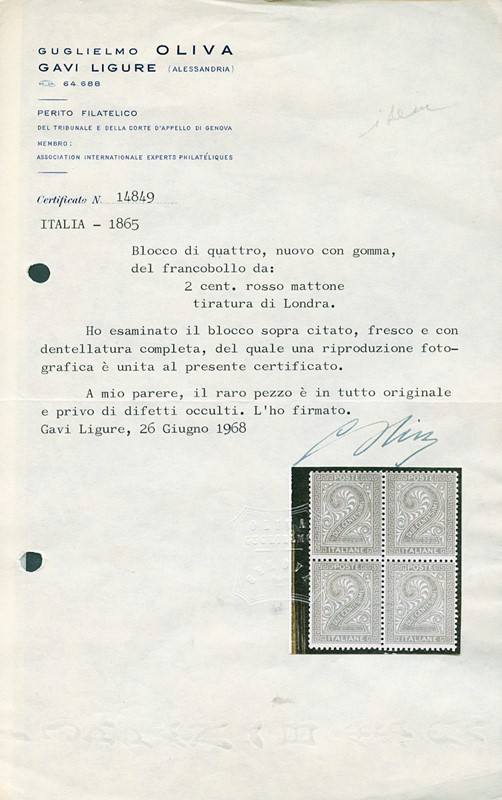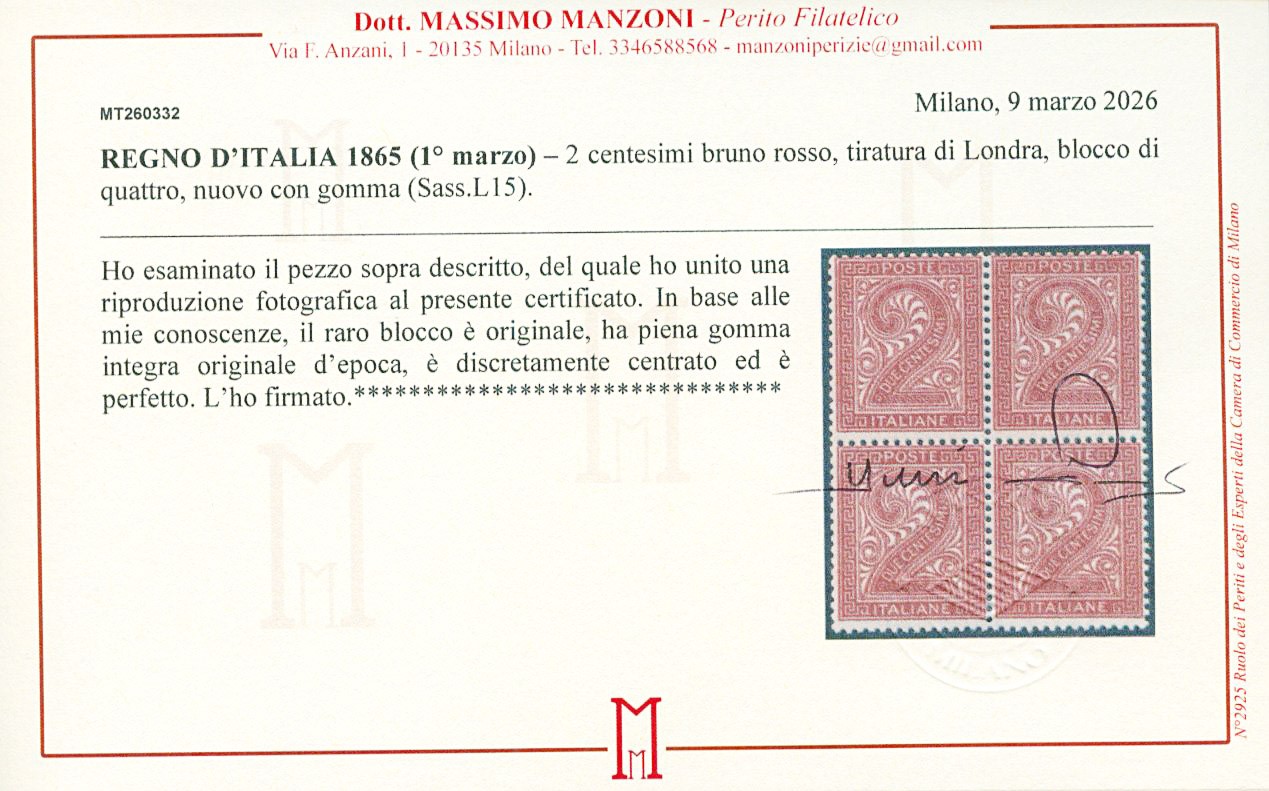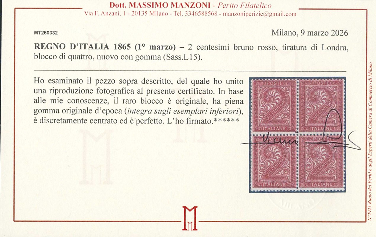 1865 - 2c bruno rosso, DLR Londra, BL4, due SL e due TL, discreta centratura. CF Oliva, Raybaudi, A.Diena e Manzoni (Sassone L15 - Euro 33.000)