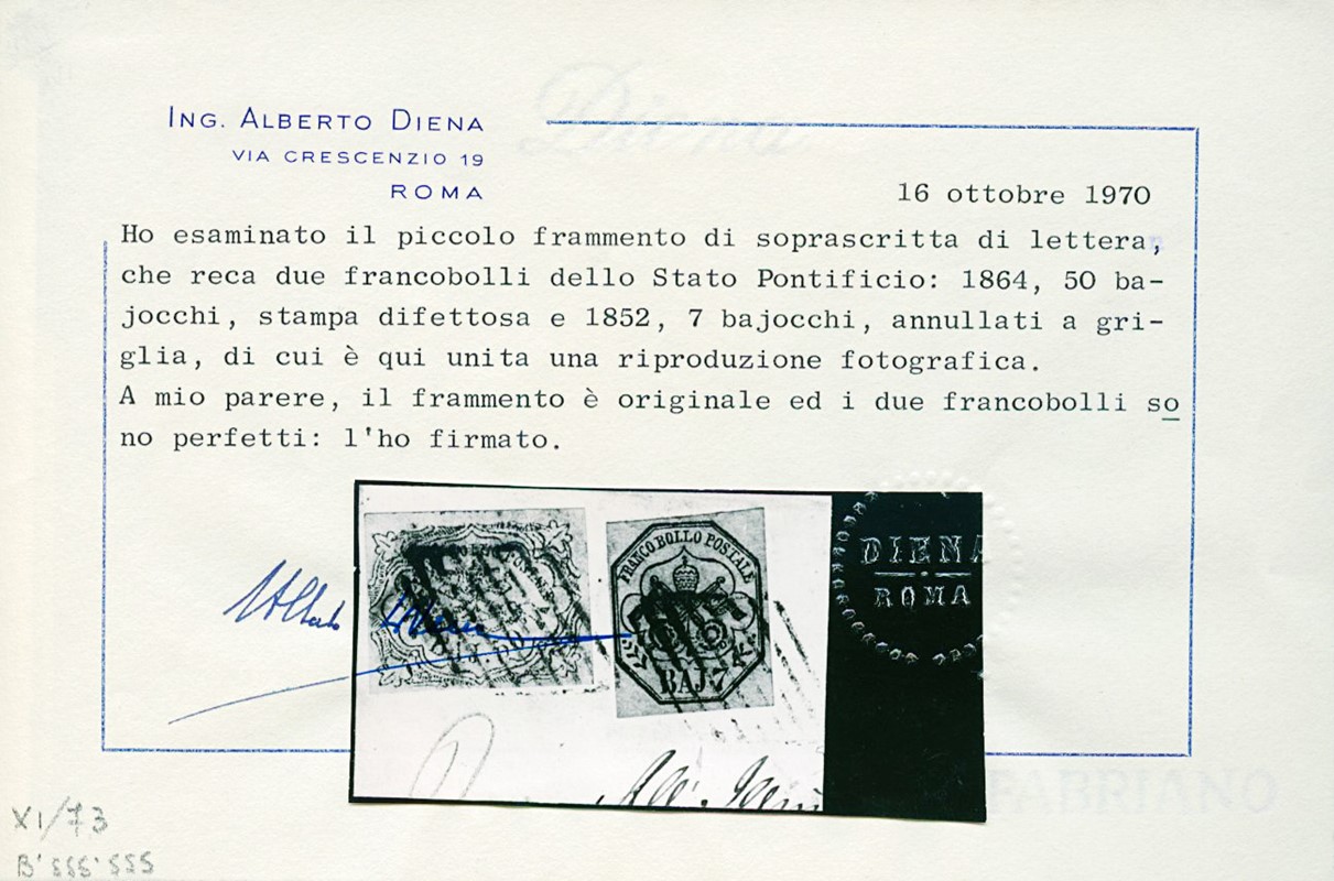 1865 - 50b azzurro oltremare scuro stampa difettosa, molto ben marginato, e 7b azzurro, annullati con muti a losanga su frammento. CF A.Diena (Sassone 8+12 - Euro 9.000+)