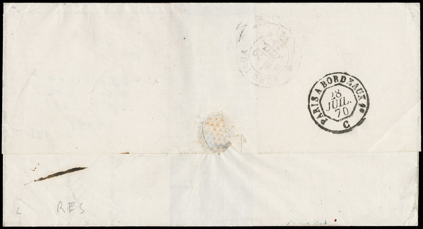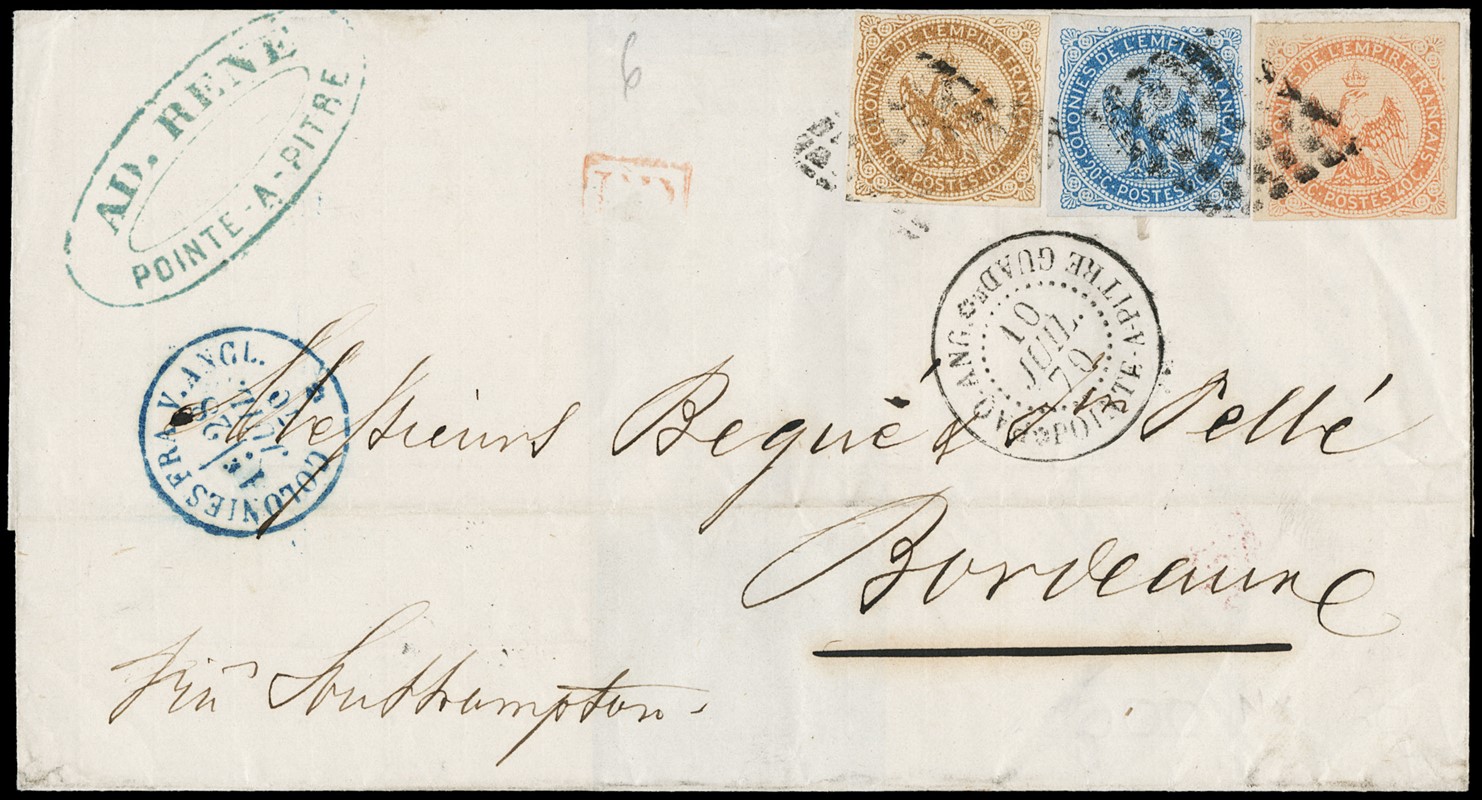 1865/69 - GUADALUPA: Aquilette 10c bistro giallo, 20c blu e 40c vermiglio, tutti con ottimi margini, da 'PAQ. ANG. POINTE A PITRE GUADe 10 JUIL.70' per Bordeaux (Yvert 3+4+5 - Euro - )