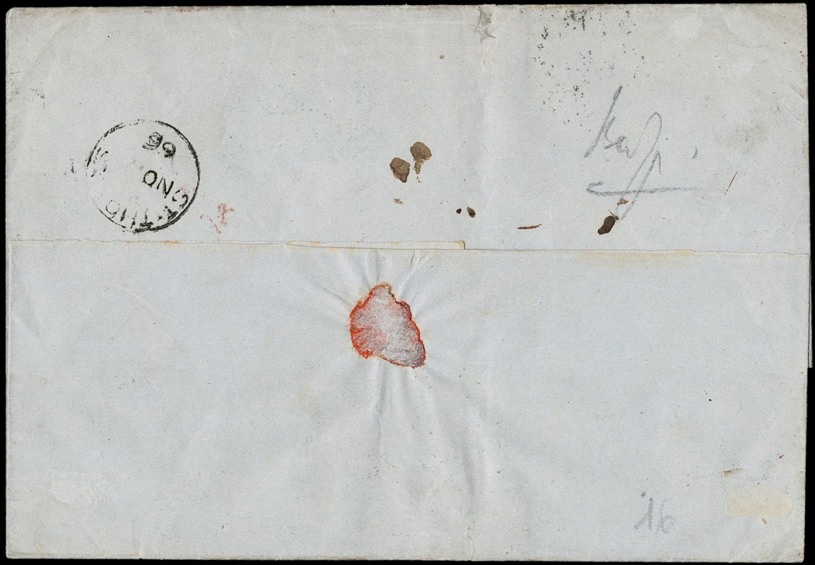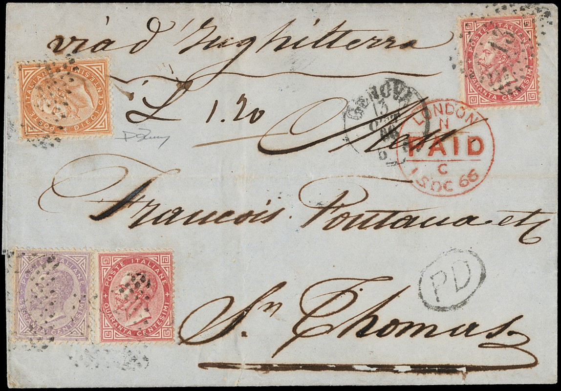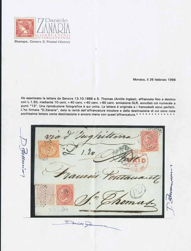 1866 - 10c ocra arancio, 40c rosa carminio, due esemplari, e 60c lilla chiaro, tutti DLR (LO), annullati con numerale a punti '13', da 'GENOVA 13 OTTOBRE 1866' a S.Thomas (Antille Inglesi). Rara destinazione con affrancatura tricolore composta da tutti francobolli in ottimo stato di conservazione. CF Daniele Zanaria (Sassone L17+L20+L21 - Euro - )