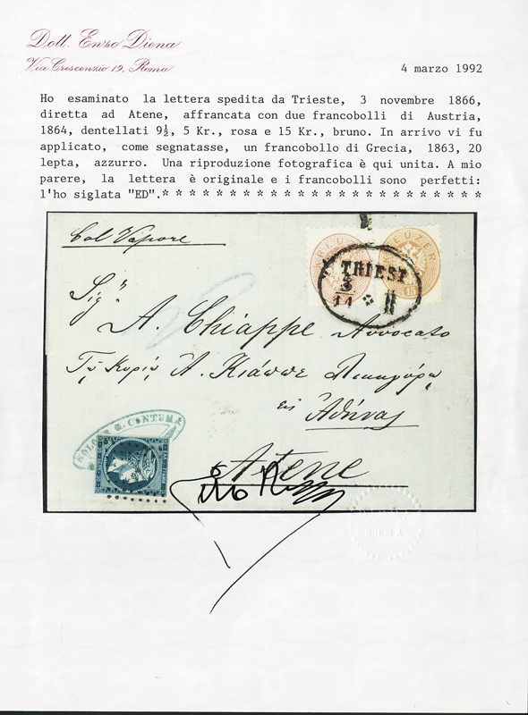 1866 - Grandi teste di Hermes, Austria, 20 lepta azzurro applicato in tassa all'arrivo ad Atene, su lettera da Trieste, affrancata in origine con Austria 5k rosa e 15k bistro (IV emissione 1863-64) annullati 'TRIESTE 3 NOV 66'. CF E.Diena (Yvert Austria 28+31 - Grecia 21 - Euro - )