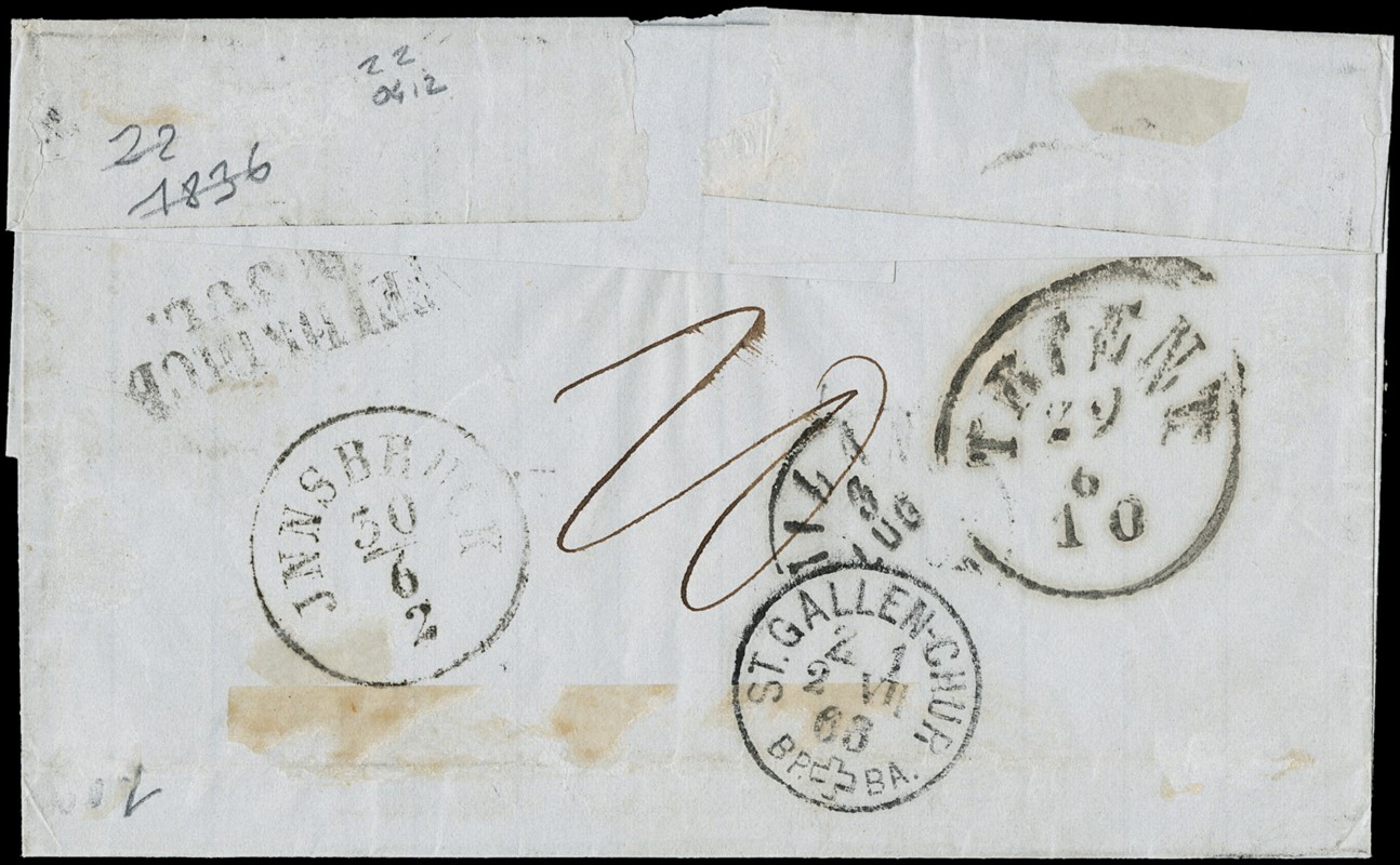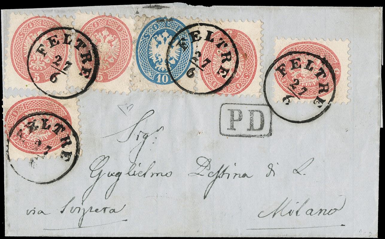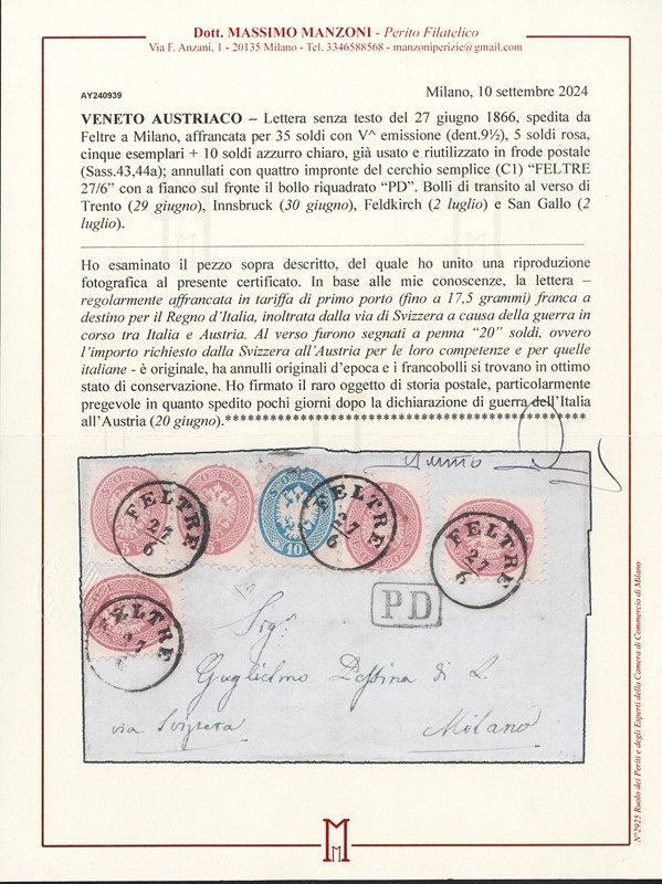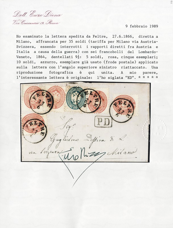 1866 - V emissione 5s rosa, cinque esemplari, e 10s azzurro, da 'FELTRE 27/6' a Milano, via di Svizzera causa guerra in corso. Rara affrancatura da 35 soldi franca a destino. Il 10s e' difettoso essendo riutilizzato in frode postale. CF E.Diena e Manzoni