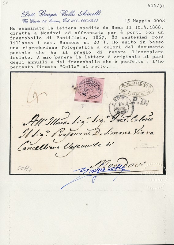1867 80c rosa lillaceo, da 'ROMA 10 APR 68' a Mondov์. Pregiata affrancatura in tariffa di porto multiplo, raro uso isolato dell'80 centesimi. Sigla E.Diena e Vaccari, CF Colla (Sassone 20 Euro 8.000)