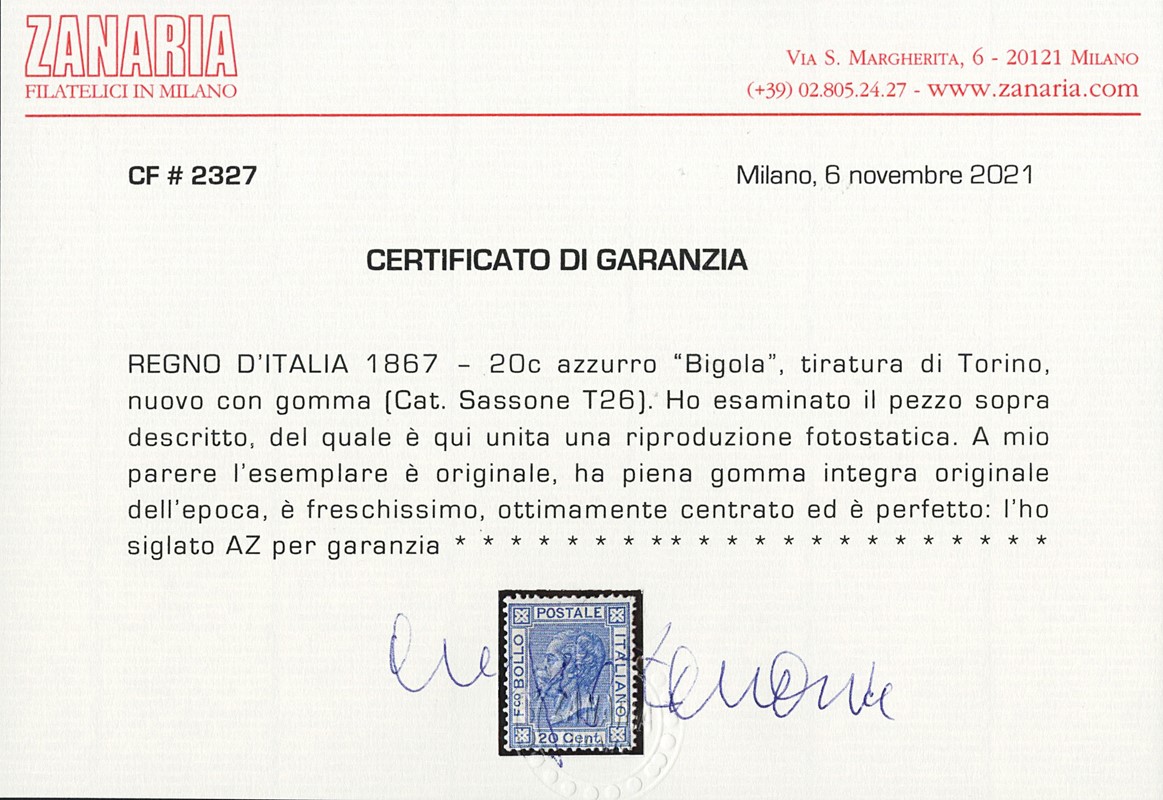 1867 - 20c azzurro Bigola, discreta centratura, SL. CF Zanaria (Sassone T26 - Euro 2.200)