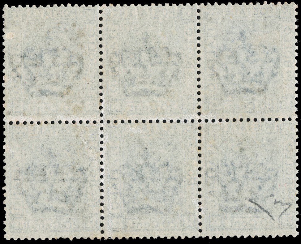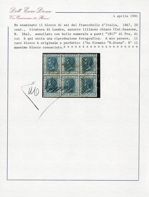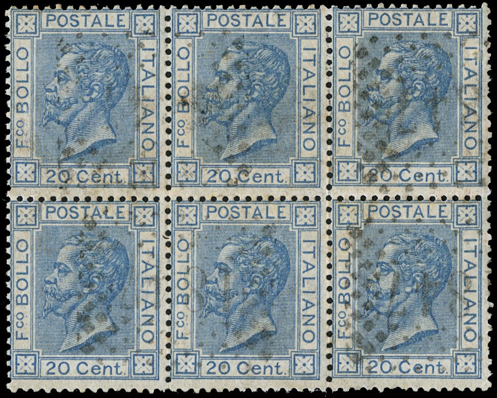 1867 - 20c azzurro lillaceo chiaro Bigola BL6 annullato con il bollo numerale a punti '1867' di Pra (GE). Massimo blocco conosciuto del 20c in questa tonalita' di colore. CF E.Diena (Sassone 26a - circa Euro 27.000)