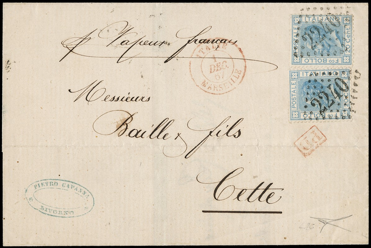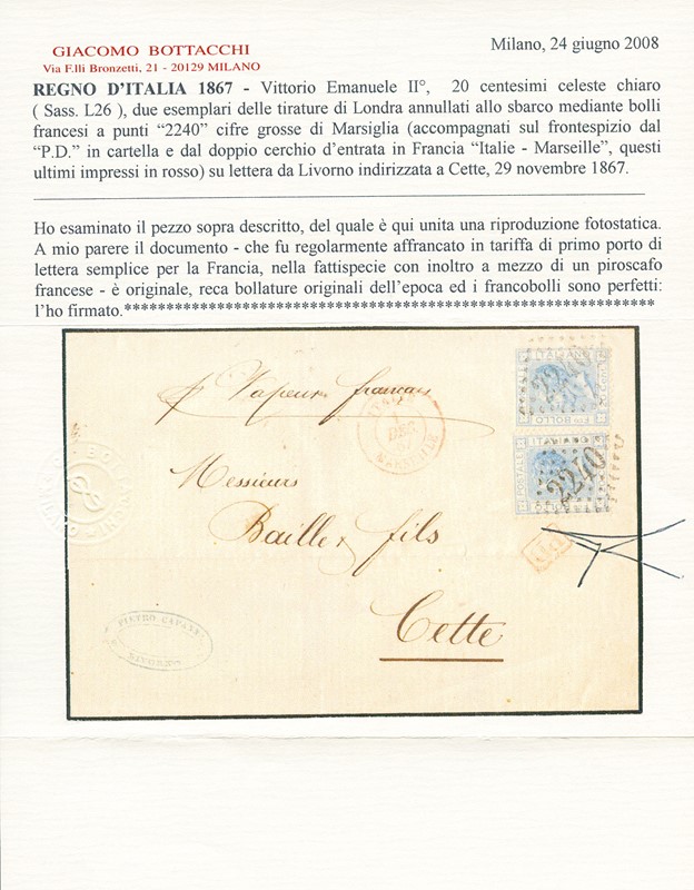1867 - 20c celeste chiaro, Bigola tir. Londra, due esemplari da Livorno a Cette (Francia), annullati allo sbarco a Marsiglia con numerale francese a punti e cifre grandi '2240'. CF Bottacchi (Sassone L26+pt.13 - Euro 10.000)