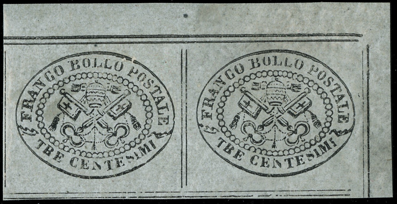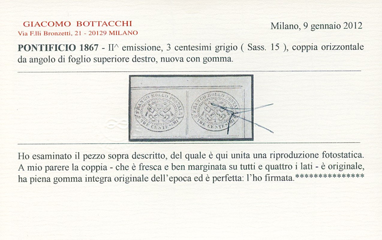 1867 - 3c grigio, coppia AdF superiore destro con filetti visibili da ogni lato, nuova con gomma integra. Firma A.Diena, CF Bottacchi (Sassone 15 - Euro 12.000+)